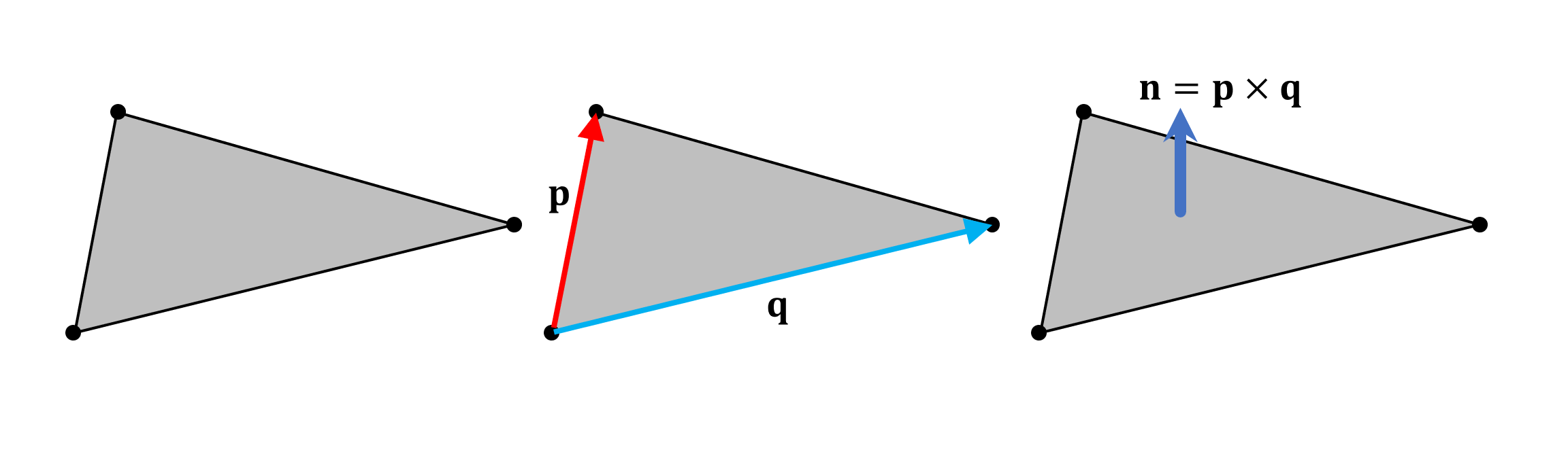 The normal of each triangle's plane is calculated by working out the vector product of the two direction vectors (p and q shown above) that form the sides of the triangle. It's actually better to work it out for each vertex, rather than for each individual triangle, but given that there will always be more of the former, compared to the latter, it's quicker just to do it for the triangles.