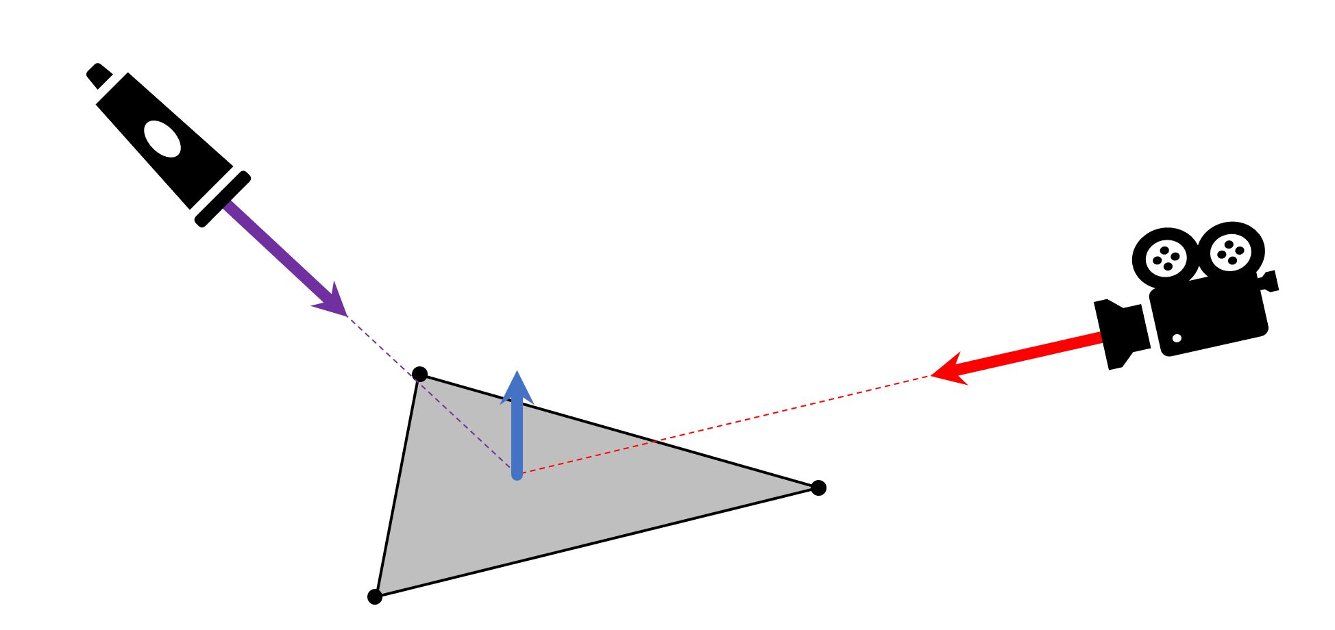 Once you have the normal of a surface, you can start to account for the light source and the camera. Lights can be of varying types in 3D rendering but for the purpose of this article, we'll only consider directional lights, e.g. a spotlight. Like the plane of a triangle, the spotlight and camera will be pointing in a particular direction, maybe something like this: