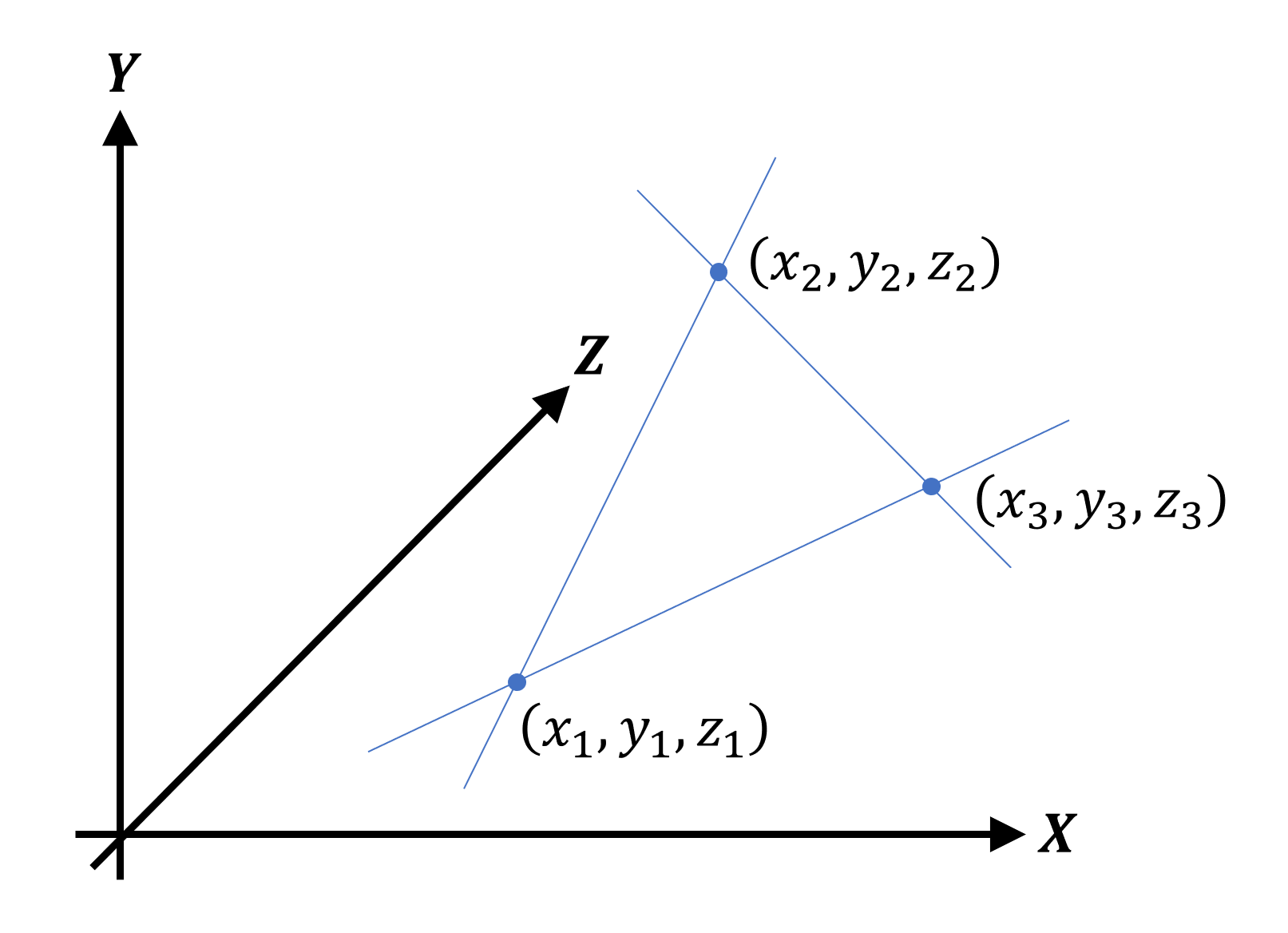 The name triangle tells us that the shape has 3 interior angles; to have this, we need 3 corners and 3 lines joining the corners together. The proper name for a corner is a vertex (vertices being the plural word) and each one is described by a point. Since we're based in a 3D geometrical world, we use the Cartesian coordinate system for the points. This is commonly written in the form of 3 values together, for example (1, 8, -3), or more generally (x, y, z).