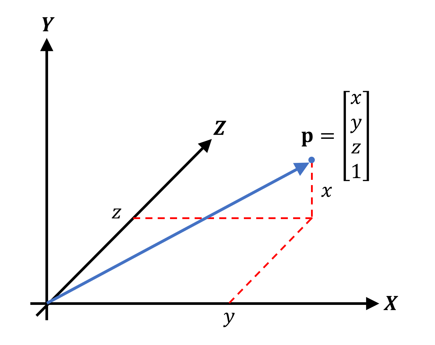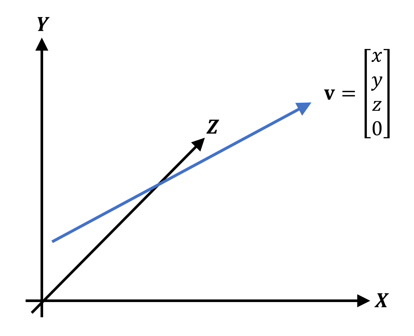 Notice how the blue arrow starts at one location (in this case, the origin) and stretches out to the vertex. We've used what's called column notation to describe this vector, but row notation works just as well. You'll have spotted that there is also one extra value - the 4th number is commonly labelled as the w-component and it is used to state whether the vector is being used to describe the location of a vertex (called a position vector) or describing a general direction (a direction vector). In the case of the latter, it would look like this: