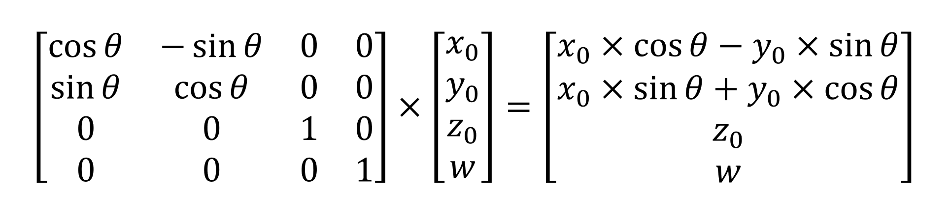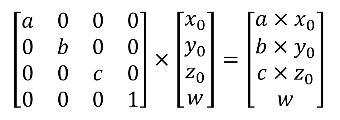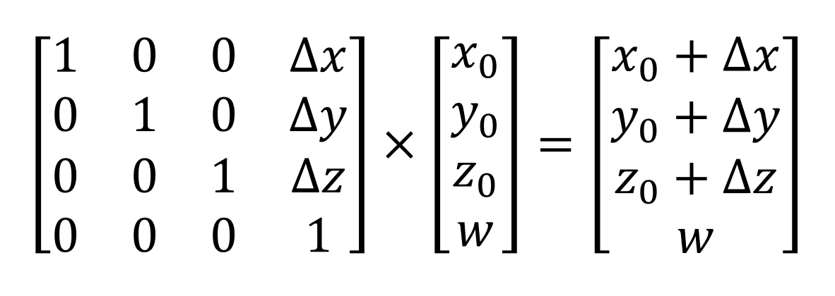 For each type of transformation we want to do, there is an associated matrix to go with it, and it's simply a case of multiplying the transformation matrix and the position vector together. We won't go through the specific details of how and why this happens, but we can see what it looks like.