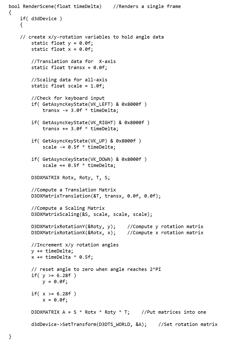 This example is an 'all-in-one transformation'. It creates the respective transformation matrices based on a keyboard input, and then applies it to the original position vector in a single operation. Note that this is always done in a set order (scale - rotate - translate), as any other way would totally mess up the outcome.