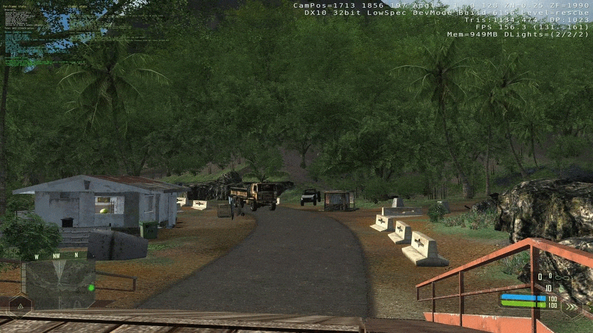 We can see some obvious things from the devmode information, such as the polygon count halving and draw calls cut to almost 25% the amount when using the very high settings. But notice how there are no shadows at all, nor any ambient occlusion or fancy lighting.