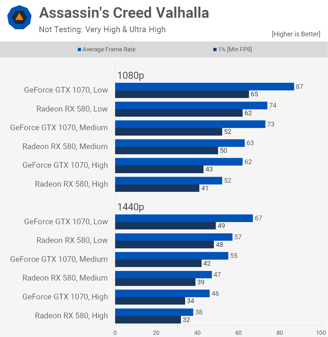 Starting with Assassin's Creed Valhalla we see that at 1080p the GTX 1070 is around 15% faster than the RX 580 and around 10% faster at 1440p. That's a great result for the aging GeForce GPU as it means it was good for around 60 fps at 1080p using the medium quality settings and then 70 fps with low.