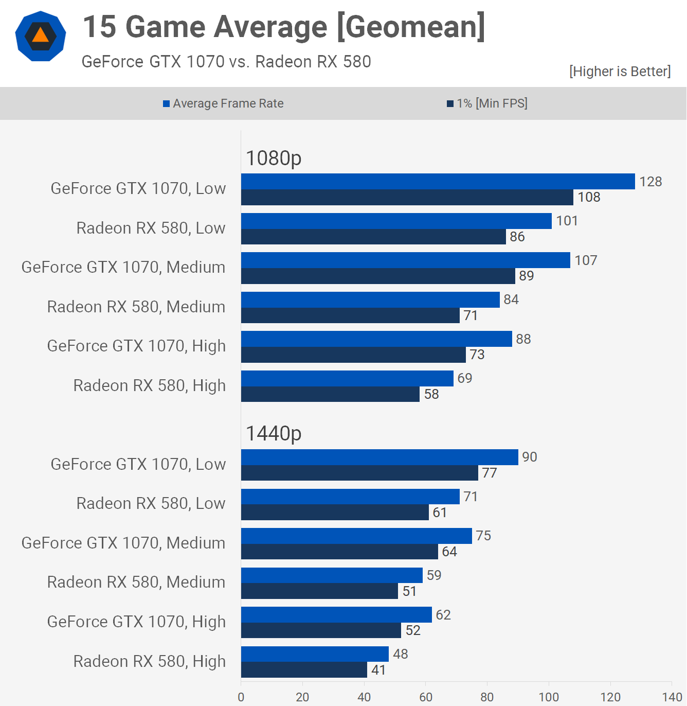 On average, the GeForce GTX 1070 offers ~27% more performance than the Radeon RX 580 at both tested resolutions across a range of quality presets. This means for 1080p gaming the GTX 1070 is still for the most part able to deliver 60 fps or better, with very few exceptions.