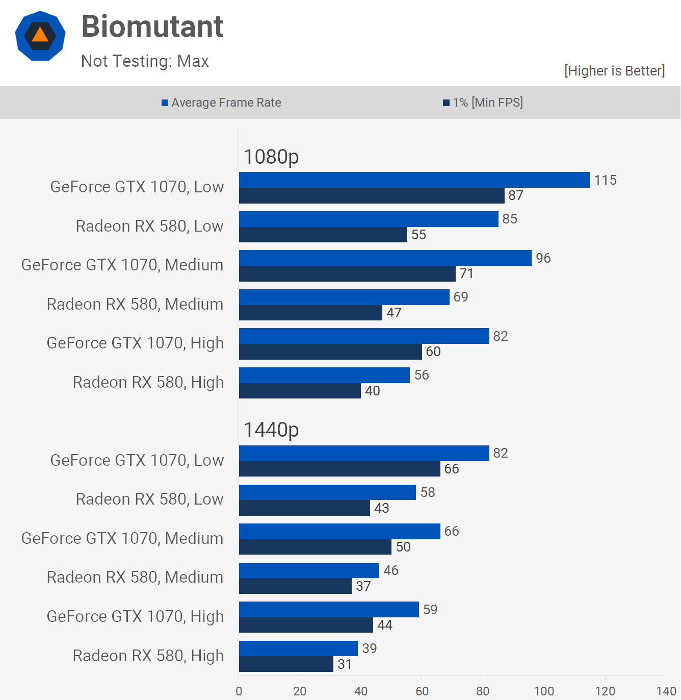 Biomutant was a bit of a struggle to run on the RX 580, especially with the high quality preset. This was far less of an issue with the GTX 1070 which was between 35 and 45% faster at 1080p, and then around 40-50% faster at 1440p.