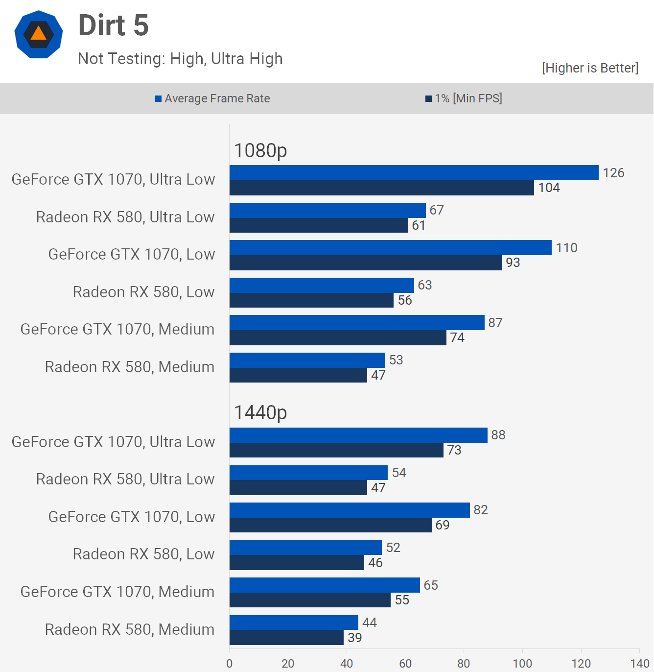 If these results look a bit odd to you it's because they are. The RX 580 runs into some kind of bug in Dirt 5, which is humorous given this is an AMD sponsored title. So the margins to the GTX 1070 are significantly larger than they should be, but that's not an issue for the GeForce GPU as it was able to deliver more than 60 fps at 1440p using the medium quality preset. The 1070 is a great second hand option for those looking to do some rally driving.