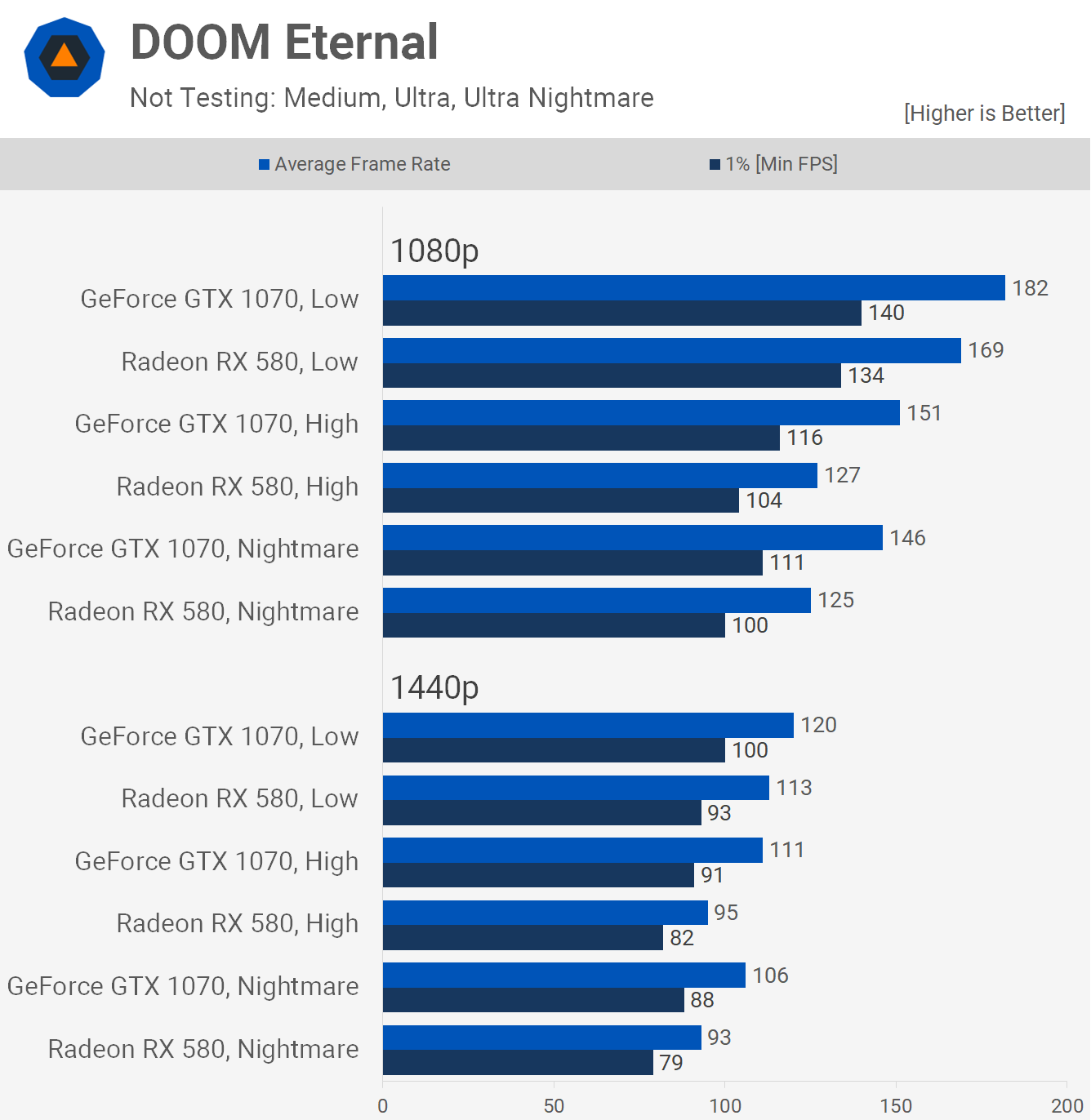 We've seen previously that Doom Eternal runs exceptionally well on the RX 580 and even the older R9 390. So it comes as little surprise to find the GTX 1070 makes out just fine, delivering over 100 fps even at 1440p using the nightmare settings.