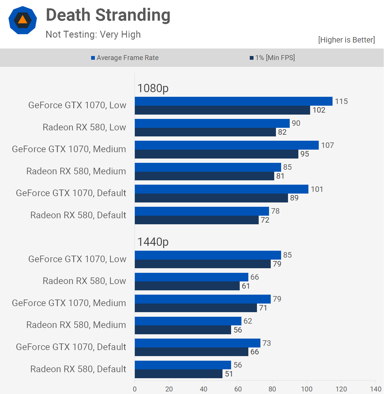 Death Stranding plays well using the Radeon RX 580 and here the GTX 1070 offers 25-30% more performance at well over 60 fps, even at 1440p using the second highest quality preset. That being the case the GTX 1070 is more than capable of delivering an enjoyable gaming experience at either 1080p or 1440p in Death Stranding.