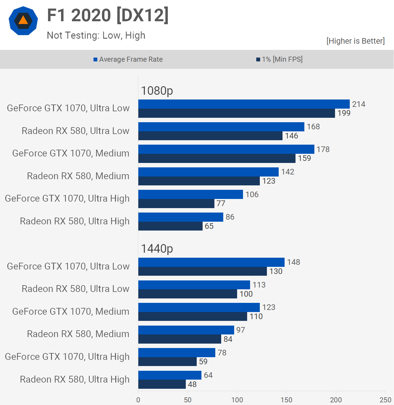 Finally we have F1 2020, where the GTX 1070 provides over 60 fps at 1440p using the highest quality preset. That being the case, 1080p gamers will be able to receive a high refresh rate experience using even the highest quality settings, so for this title you don't need anything more than a 1070.
