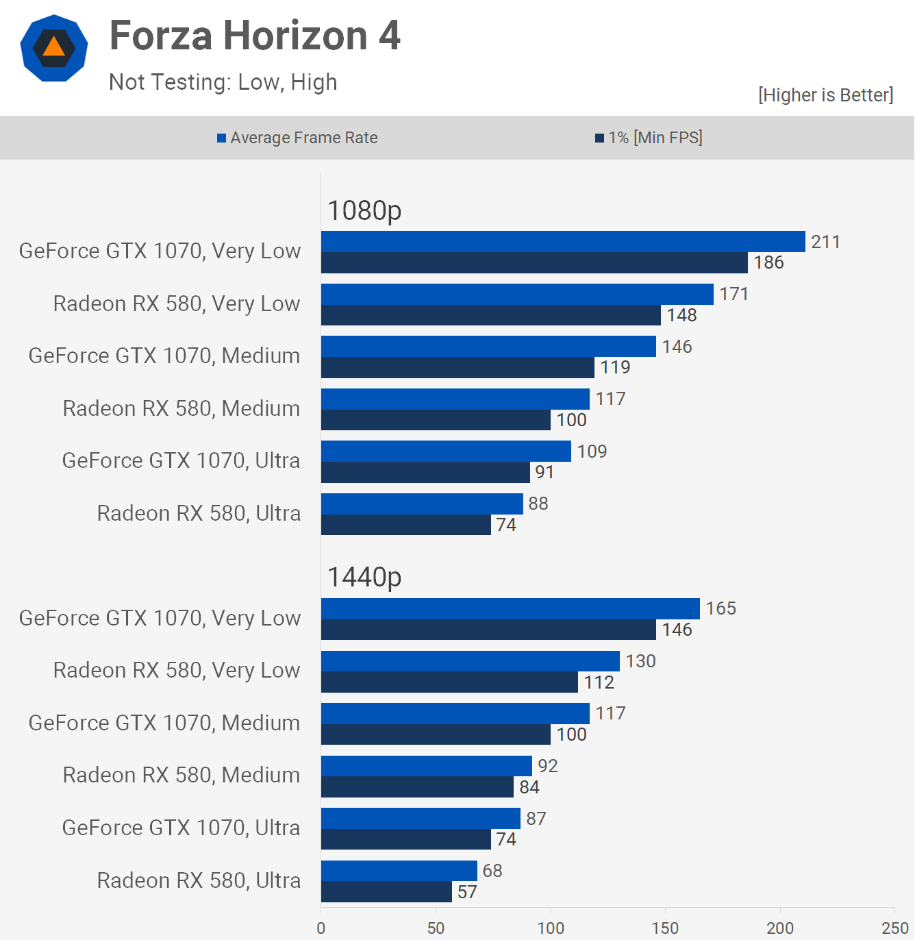 Given what we've seen so far it will probably come as little surprise that the GTX 1070 is able to run Forza Horizon 4 with ease, averaging 87 fps at 1440p using the highest in-game quality preset. For high refresh rate gaming, the medium quality preset will work at 1440p, but if for some reason you require even more performance the Pascal GPU was able to render 165 fps using the very low quality preset.