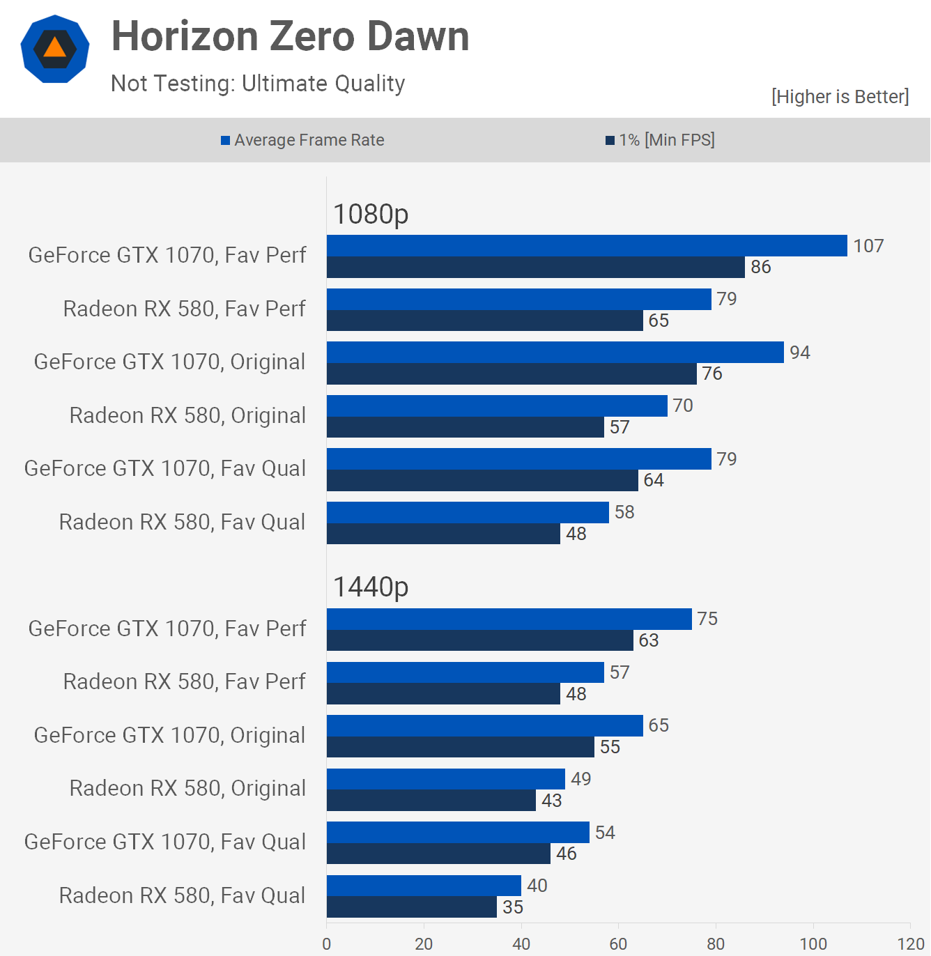 The GTX 1070 was also in a completely different class when testing with Horizon Zero Dawn. We're looking at a ~35% performance boost and that meant well over 60 fps at 1080p using even the favor quality preset and then over 60 fps at 1440p using the original quality preset. That's a solid result and plenty of performance at respectable quality settings for gamers to enjoy this title.