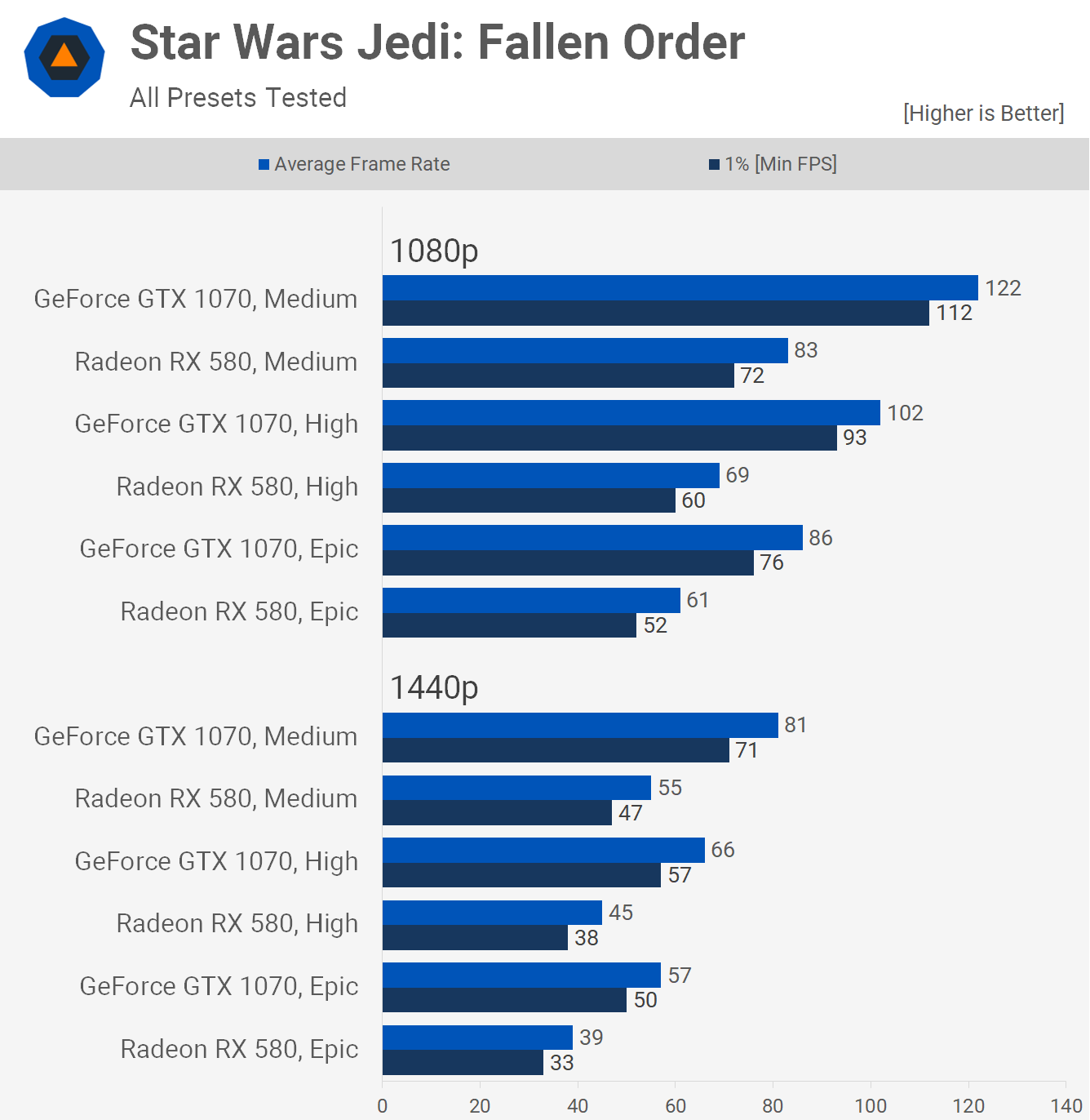 The second last game tested is Star Wars Jedi: Fallen Order where the GTX 1070 is simply in another league, offering 40-50% more performance than the RX 580.
