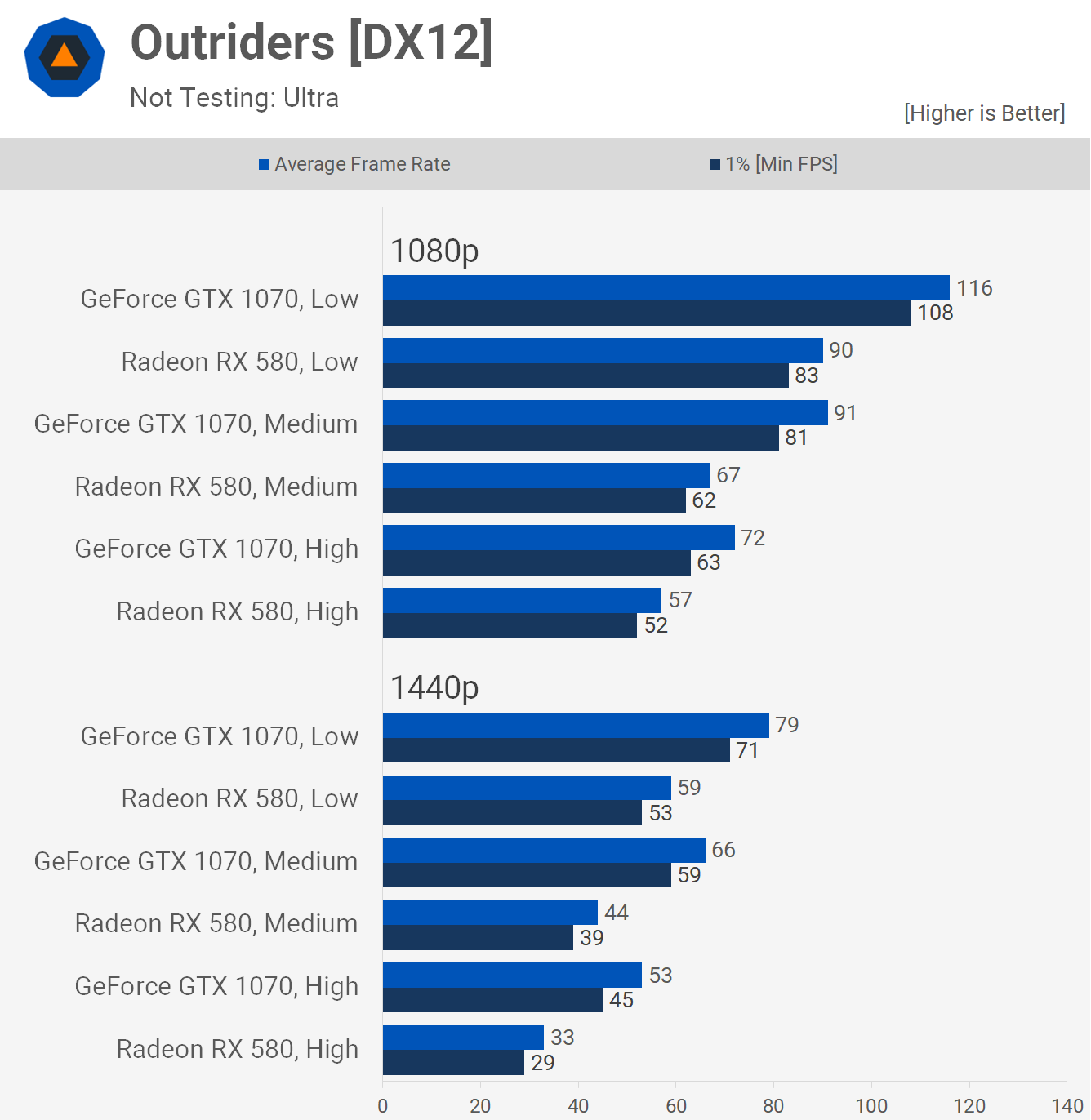 The GTX 1070 proves once again that it's still very capable of tackling the latest games, this time pushing well over 60 fps in Outriders using the high quality preset. Even at 1440p performance was good, 66 fps using medium was a great experience and even 53 fps with the high quality settings wasn't bad, it was also an impressive 61% performance increase over the RX 580.