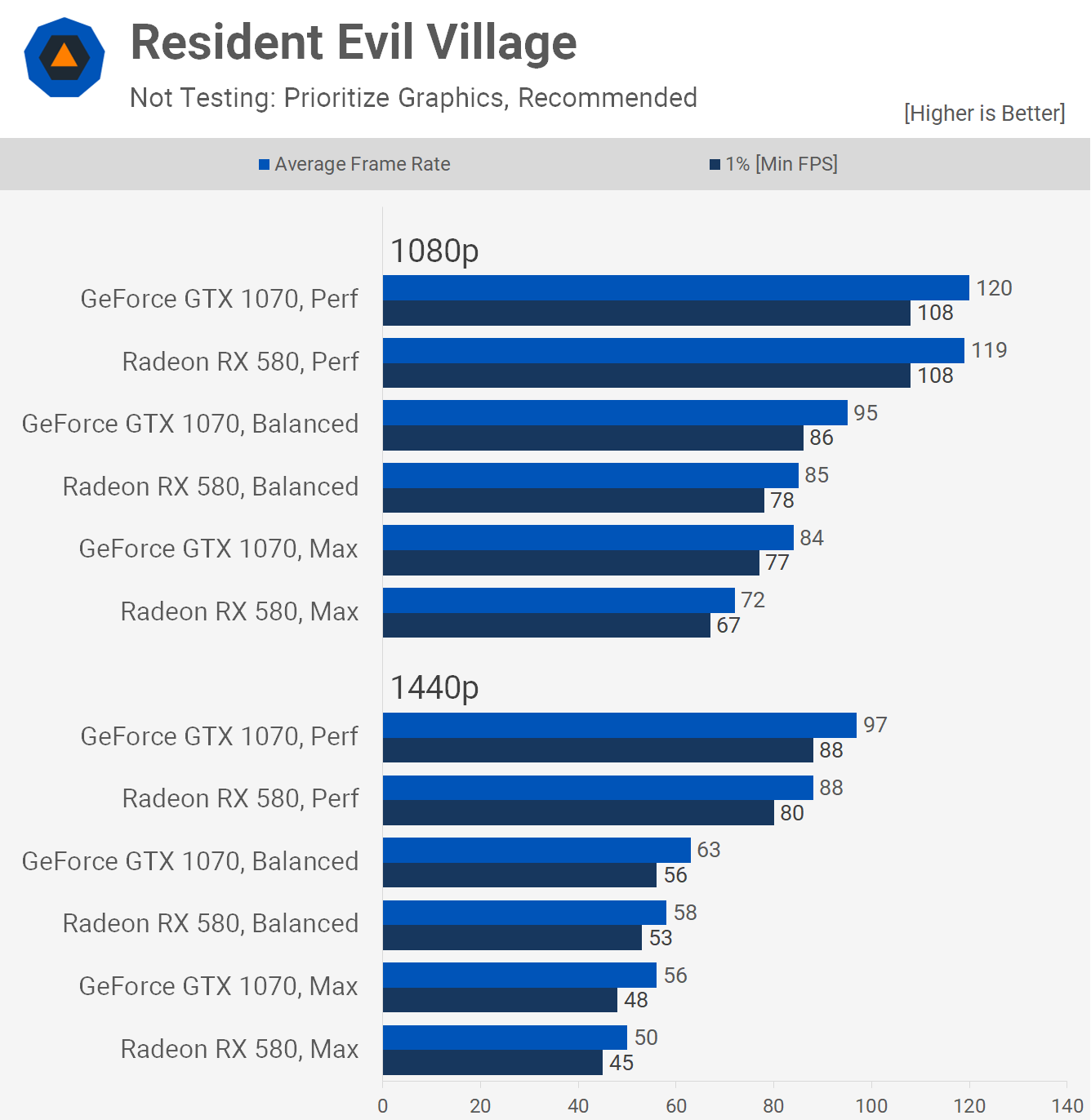 Resident Evil Village played exceptionally well on the RX 580, but even so the GTX 1070 has a little extra to offer, at least when not CPU limited which is what we see at 1080p using the performance preset, capping us at around 120 fps. Using the maximum quality preset we're looking at up to a 17% performance improvement with 84 fps on average and then 12% at 1440p, jumping up from 50 to 56 fps.