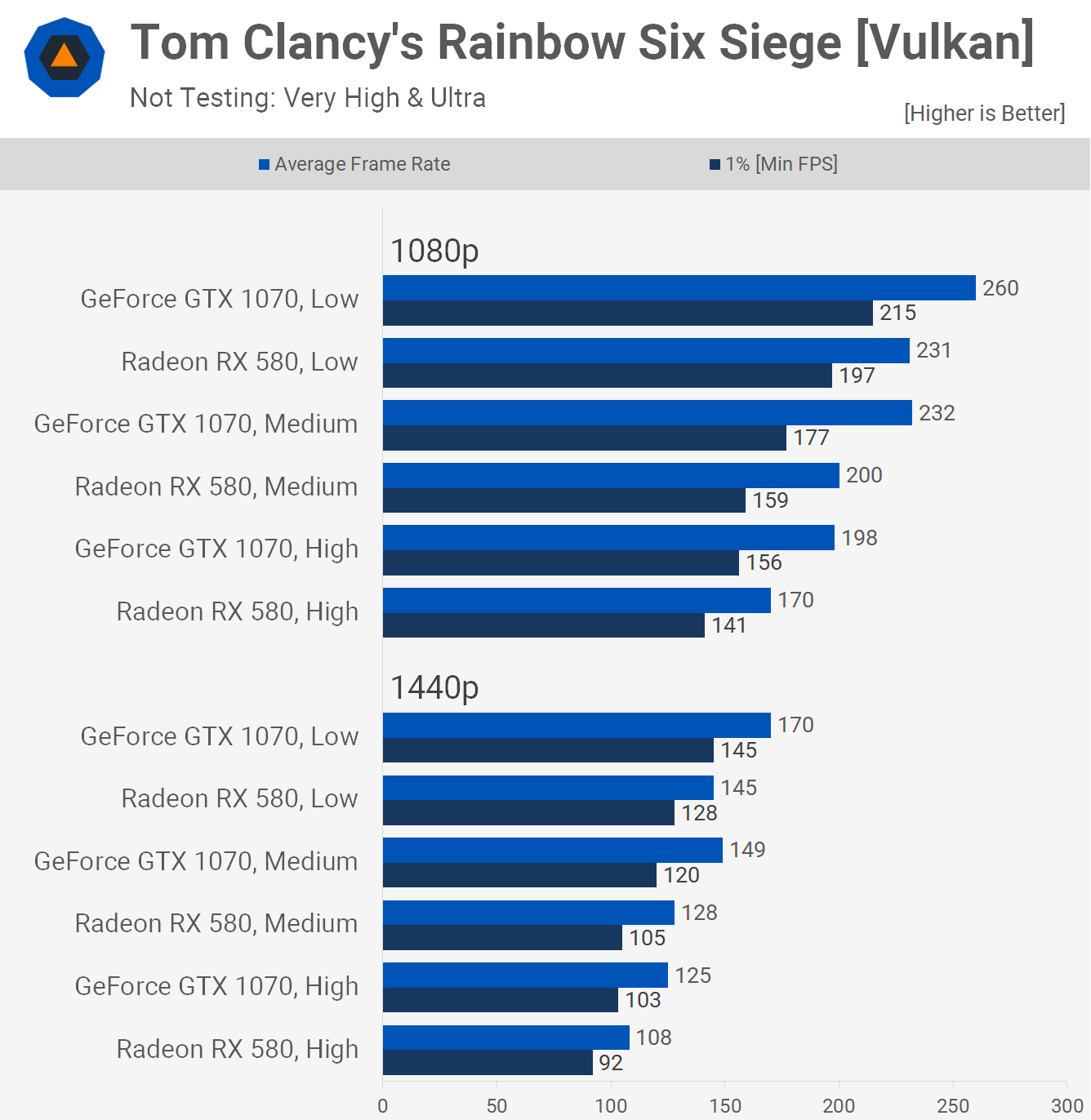 Next up we have Tom Clancy's Rainbow Six Siege and here the GTX 1070 was blistering fast, leaving the RX 580 behind by a 16% margin at 1080p and 1440p when using the medium and high quality settings.
