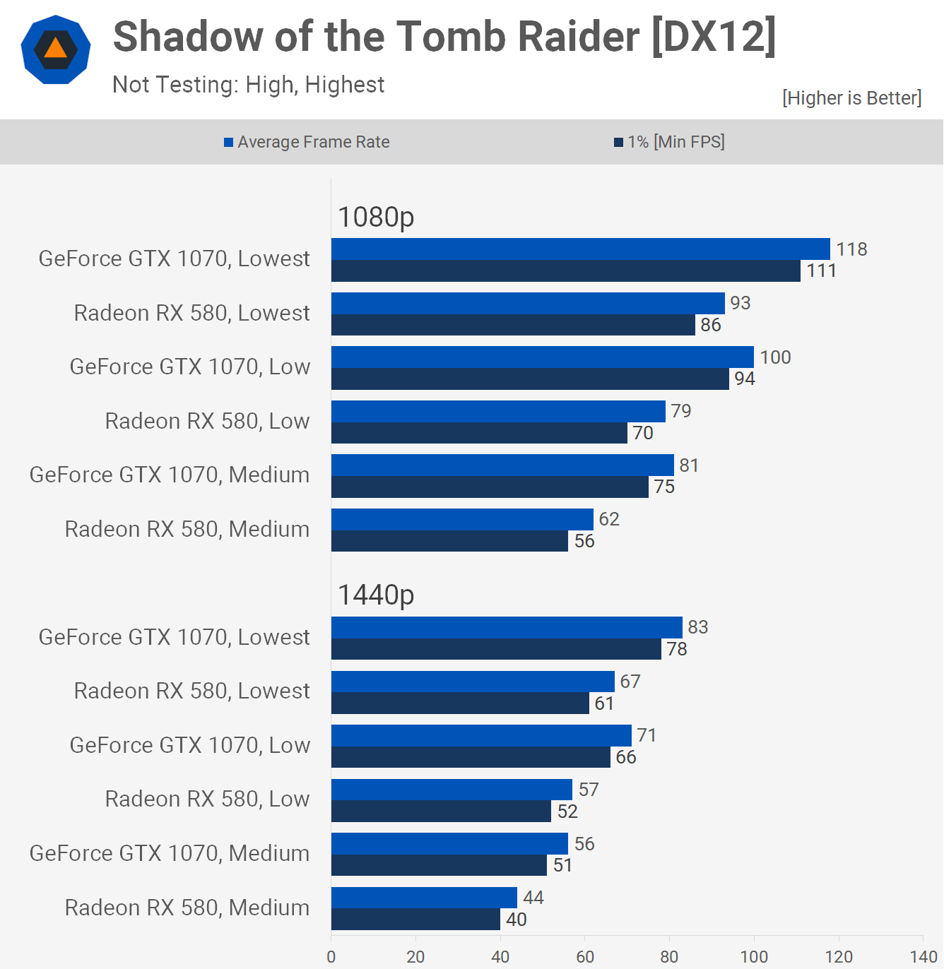 We're looking at around 25-30% more performance in Shadow of the Tomb Raider with the GTX 1070 and that allows for well over 60 fps at 1080p using respectable quality settings, such as the medium preset which still looks very good.