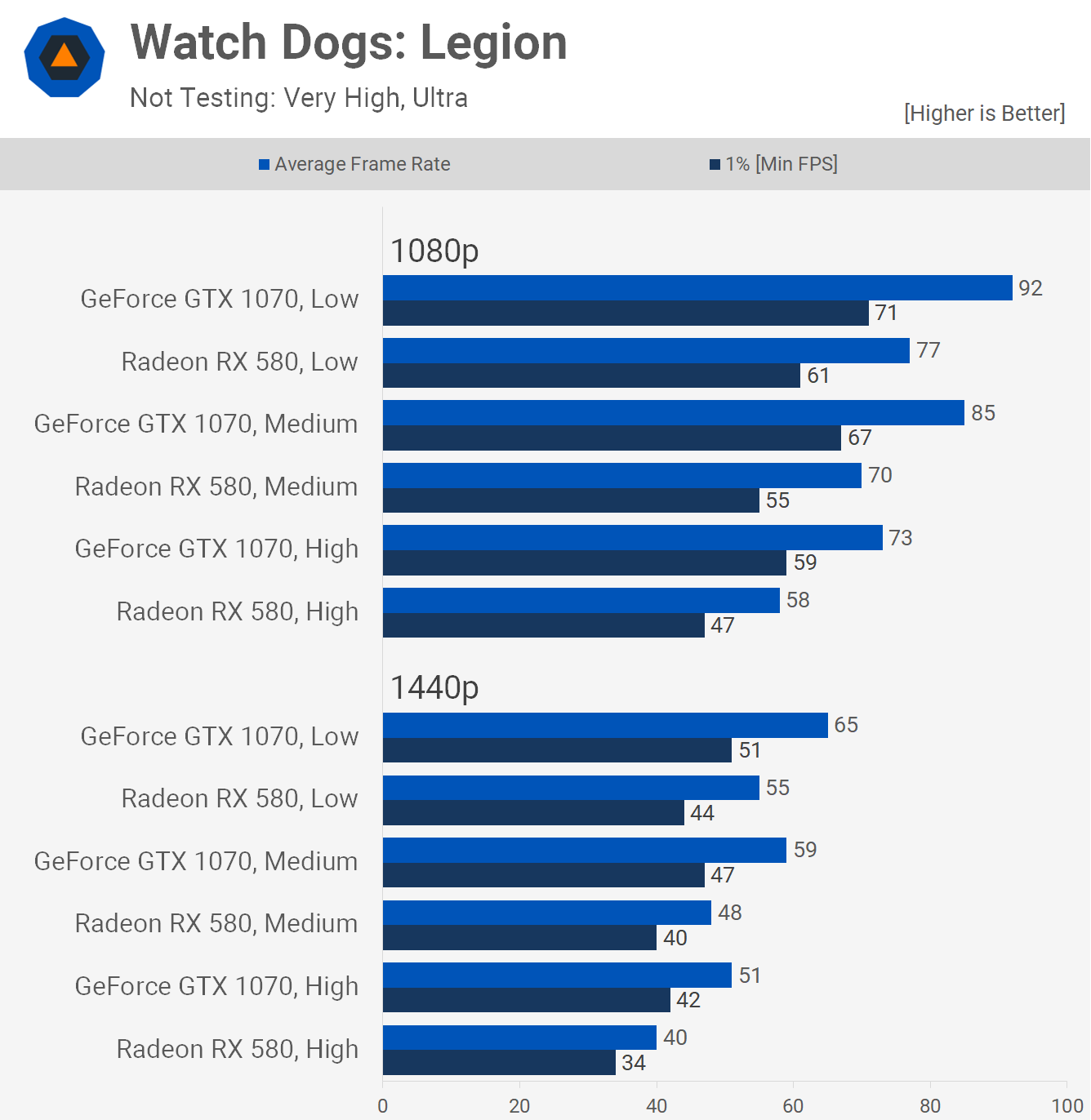 Moving on, we have Watch Dogs: Legion and here the GTX 1070 offered ~20-25% more performance and the extra frames came in particularly handy when using the high quality preset which saw the GeForce GPU render 73 fps on average at 1080p and 51 fps at 1440p.