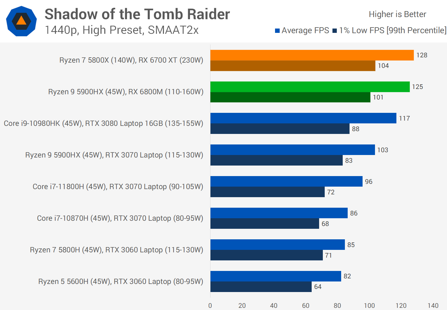 Starting with the gaming results, we have Shadow of the Tomb Raider running at 1440p using High settings. There isn't much of a difference between the desktop with the 6700XT and the laptop with the 6800M in this title, both deliver a very playable high frame rate experience of around 120 FPS.