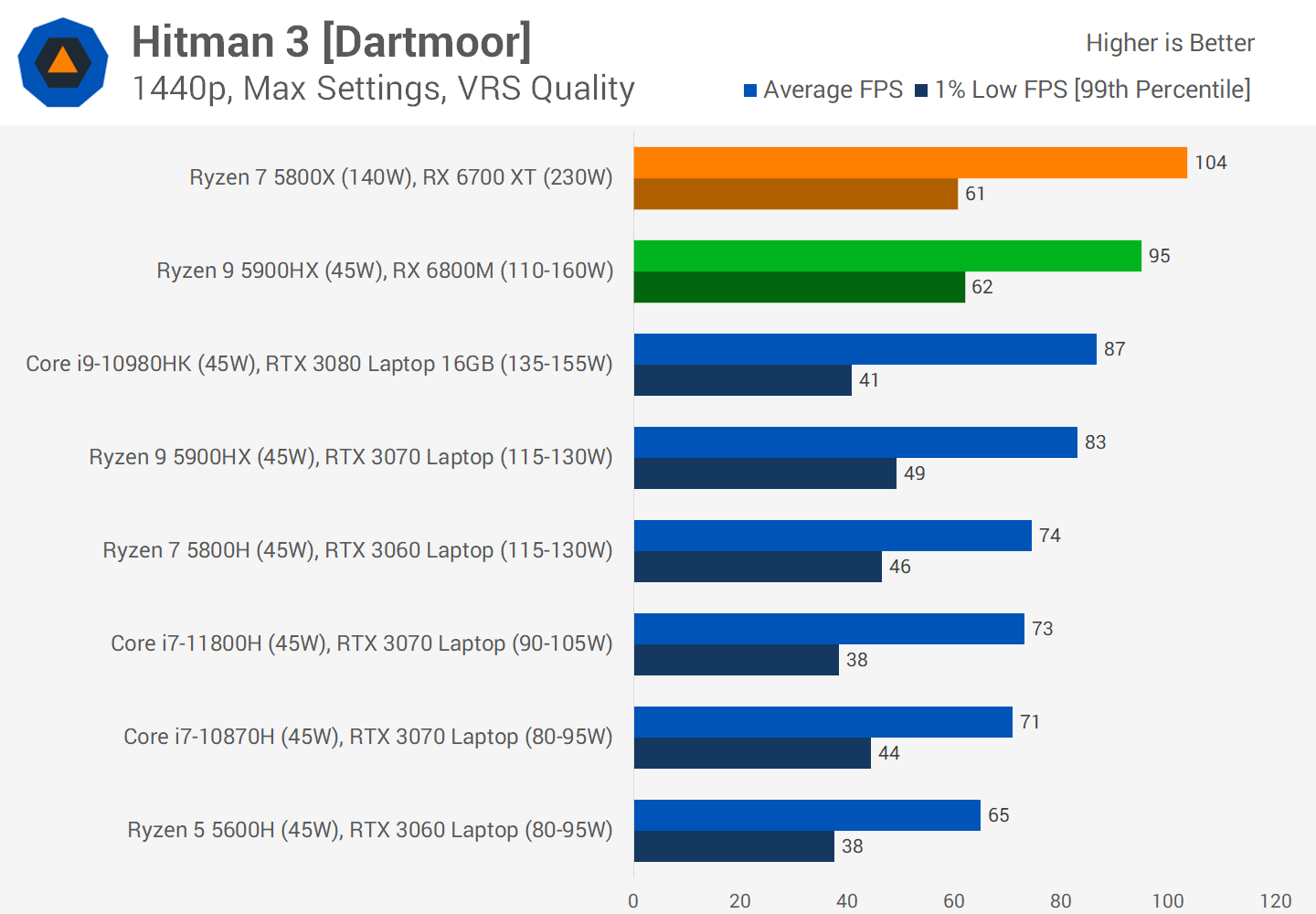 The Hitman 3 Dartmoor benchmark results are really interesting. I was expecting in this game that can hit the GPU and CPU quite hard that the desktop would be well ahead. But that's not really the case. In terms of 1% lows, the desktop and laptop are basically equivalent, so in the CPU heavy sections of the benchmark pass, whether you have a 5800X or 5900HX it doesn't make much difference. However on average, the desktop is able to pull away, delivering a modest 9 percent performance advantage.