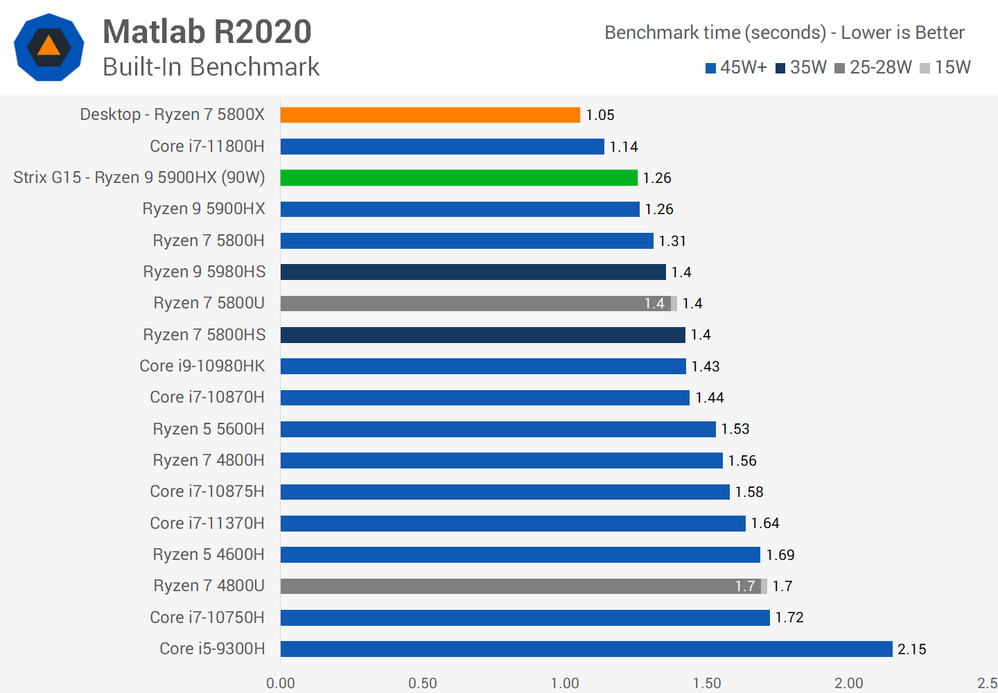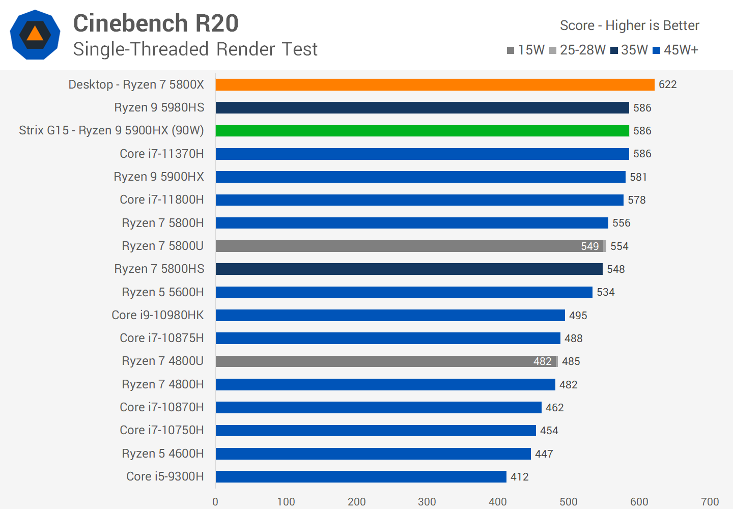 In something like Cinebench R20 multi-threading, the 5800X comes in 9 percent faster than the 5900HX, which in the Strix G15 is able to sustain up to 90W on the CPU in the heaviest CPU-only workloads. The 5800X in our test system used about 140W, and that was enough to sustain slightly higher clocks and deliver better performance.