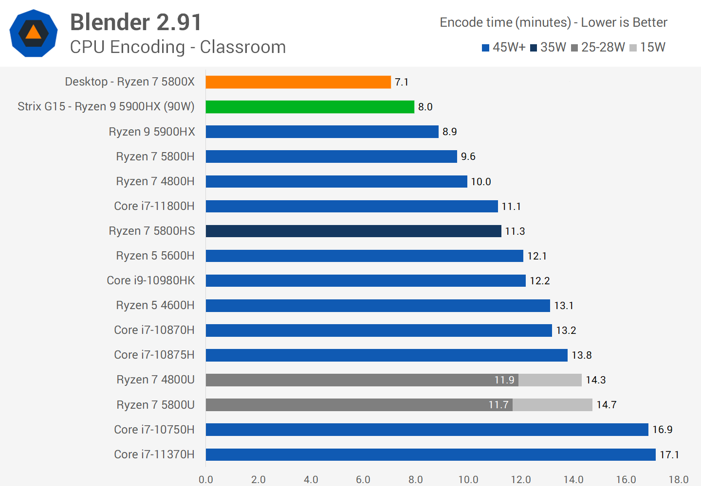 In some longer workloads like Handbrake, the desktop has a more substantial performance advantage over the laptop. Here the 5800X was over 20 percent faster, which does make a decent difference to video encoding. Blender was around 13 percent faster in favor of the desktop Ryzen 7 processor.