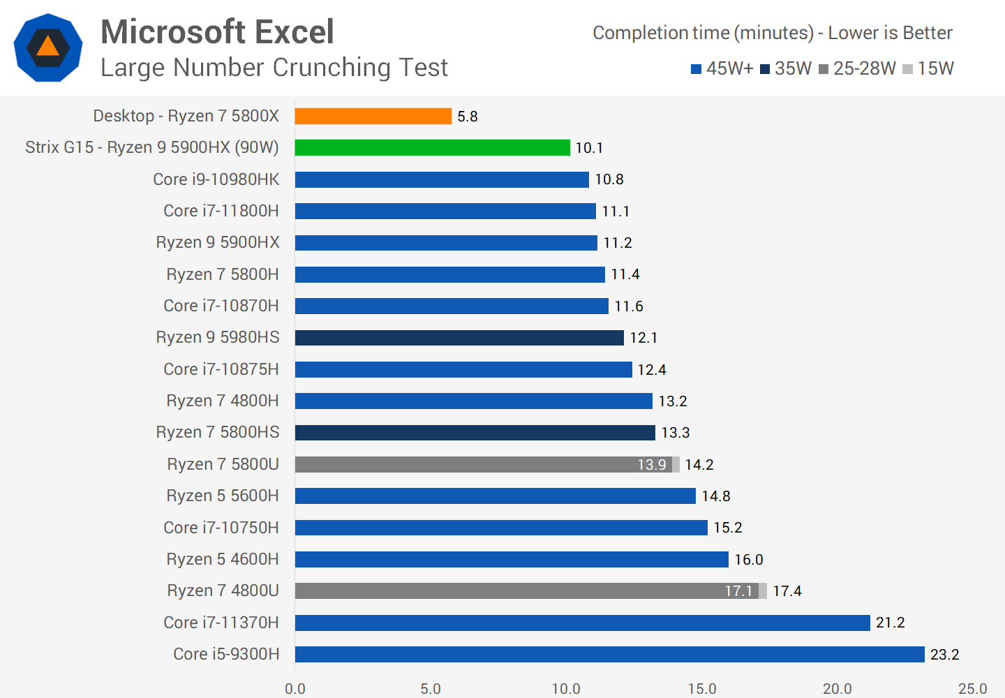 Our other CPU limited productivity workloads were a bit of a mixed bag. Our Microsoft Excel test for example was an edge case where the 5800X absolutely smokes the 5900HX thanks to having double the amount of L3 cache - 32 MB on the desktop, vs 16 MB in AMD's mobile CPUs.