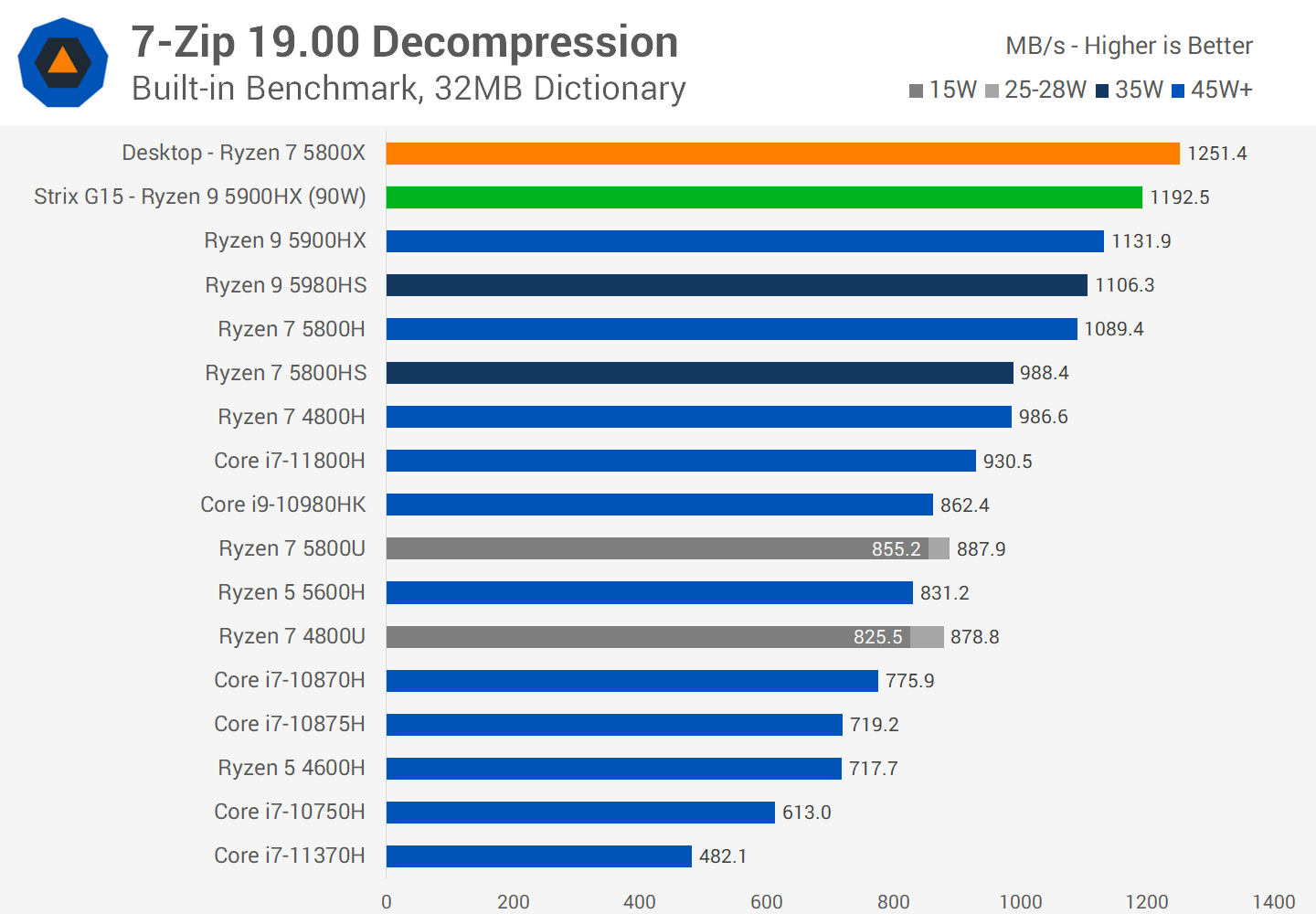 But in something like 7-Zip Decompression, we're only seeing a small advantage for the 5800X of around 5%, so the mobile 5900HX is essentially giving you decompression performance equivalent to AMD's 8-core desktop CPU.