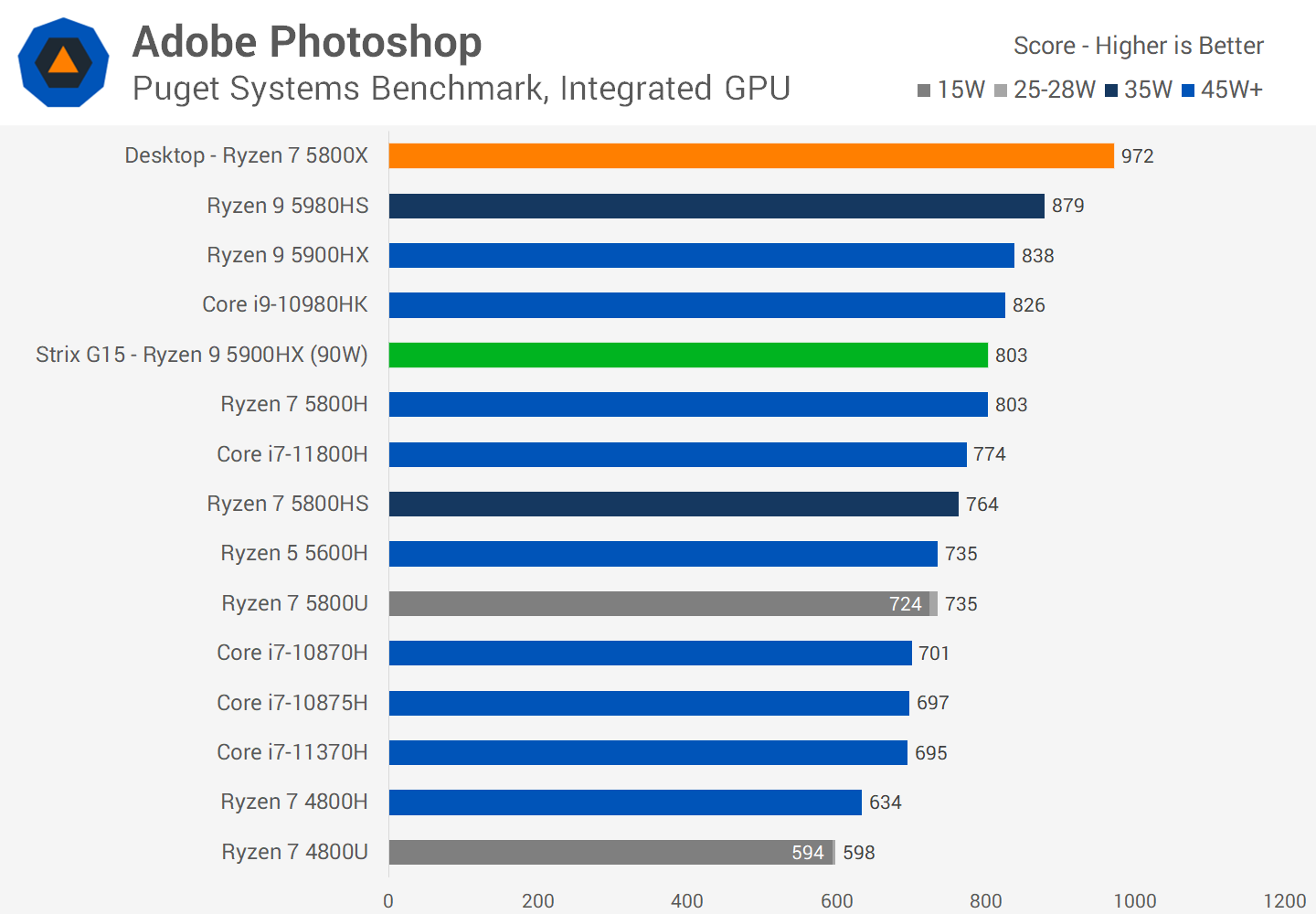 Pretty similar story in Photoshop, while the 5900HX is overall a decent processor, it just can't keep up with the desktop 5800X that uses a different configuration of its Zen 3 CPU cores. In this benchmark the desktop was 21 percent faster and easily beats the laptop playing field.