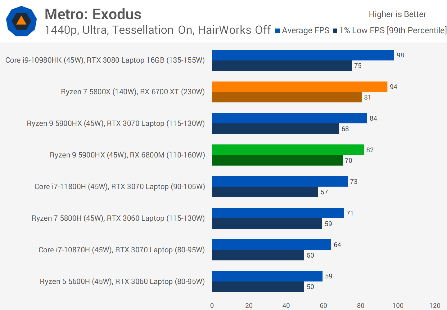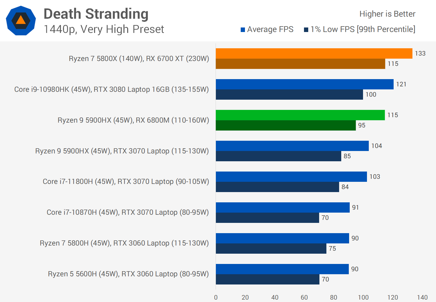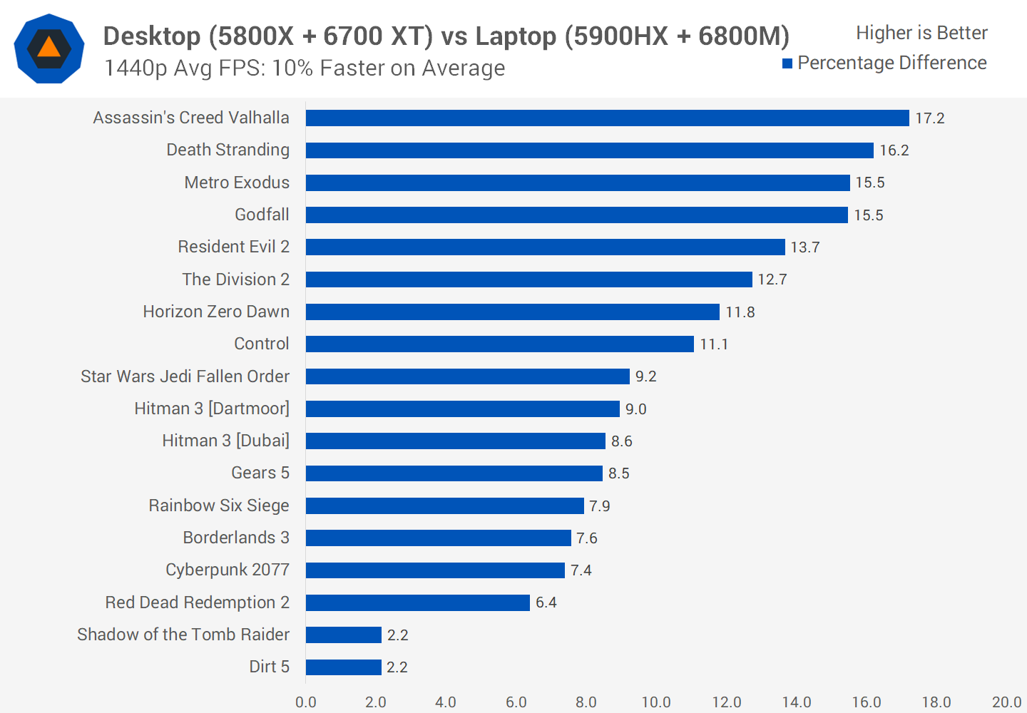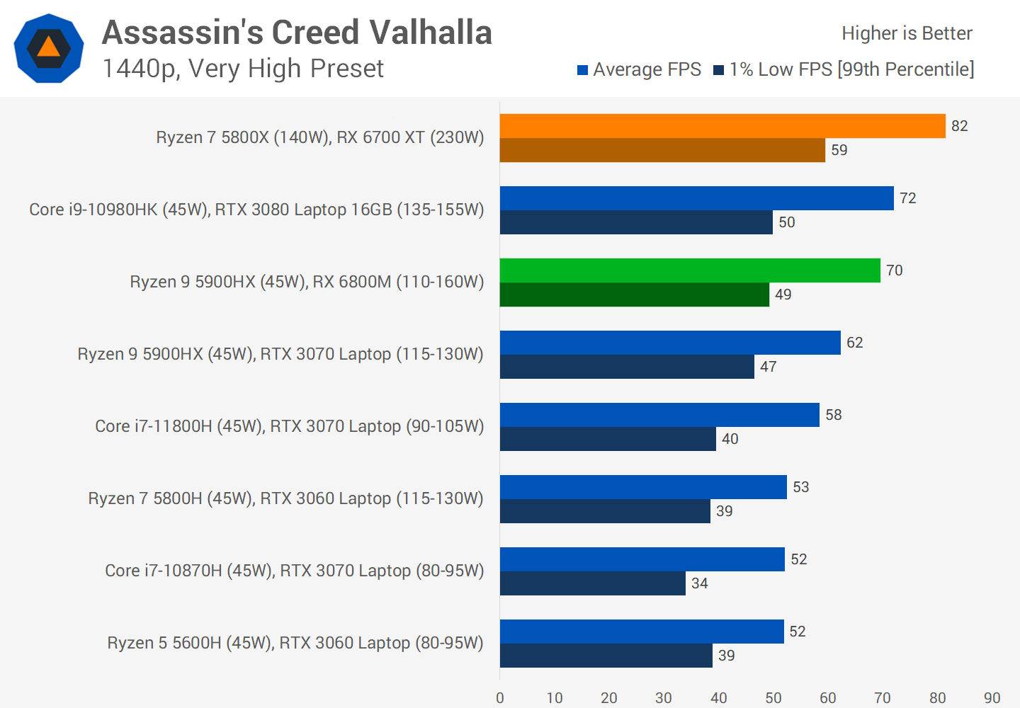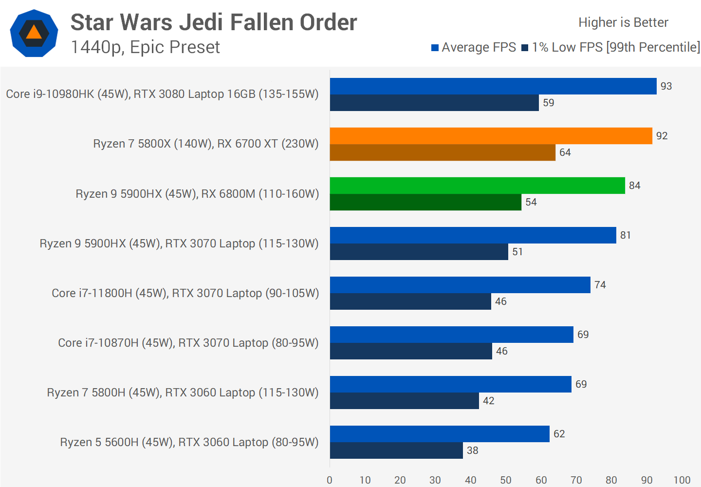 Star Wars Jedi Fallen Order is an interesting mixture of CPU demanding, particularly on a single thread, and GPU demanding at 1440p. This is another game where the desktop comes out ahead, particularly in 1% lows which are 18% higher with the 5800X CPU configuration versus the laptop's 5900HX. Average frame rates are also higher in favor of the desktop, but with a smaller 9 percent margin.