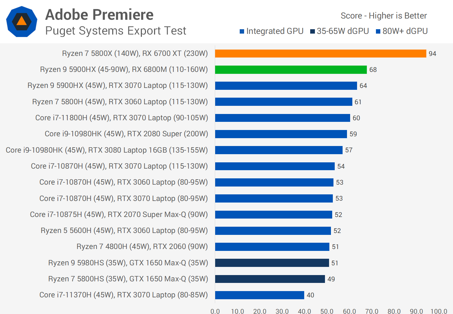 What's the reason for this? Combined CPU and GPU workloads are a worst-case scenario for laptops. Even with SmartShift, there's only a total of 180W of power to go around, split between the CPU and GPU. On the desktop platform, there is no such constraint, so the CPU and GPU can blast away with a combined 350W of power if it wants to. Premiere hits both components hard, takes advantage of this on a desktop but suffers on a laptop by comparison.