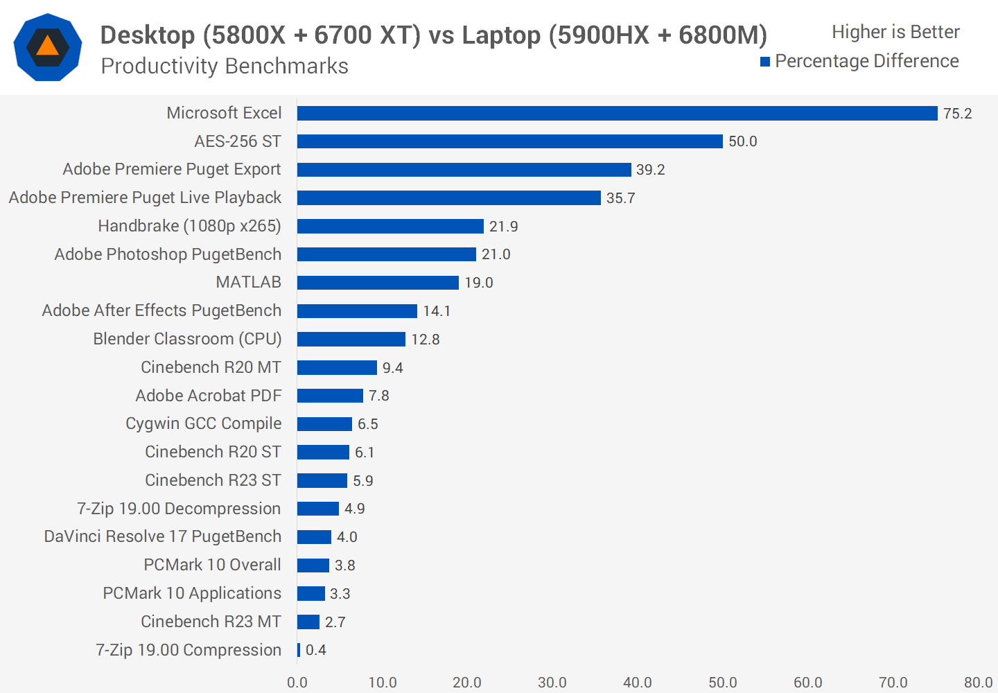 Looking at a direct head to head comparison in productivity workloads, the desktop system is faster, but how much faster depends on the specific workload.
