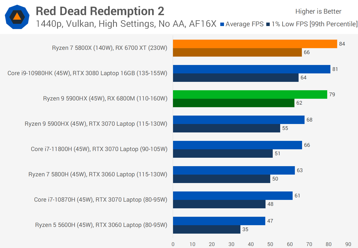 Red Dead Redemption 2 is pretty straightforward. The desktop PC ends up 6 percent faster than the all-AMD laptop, which is better performance, but we're only talking about a 5 FPS margin so the 6800M gets close to what the 6700 XT can do on the desktop.