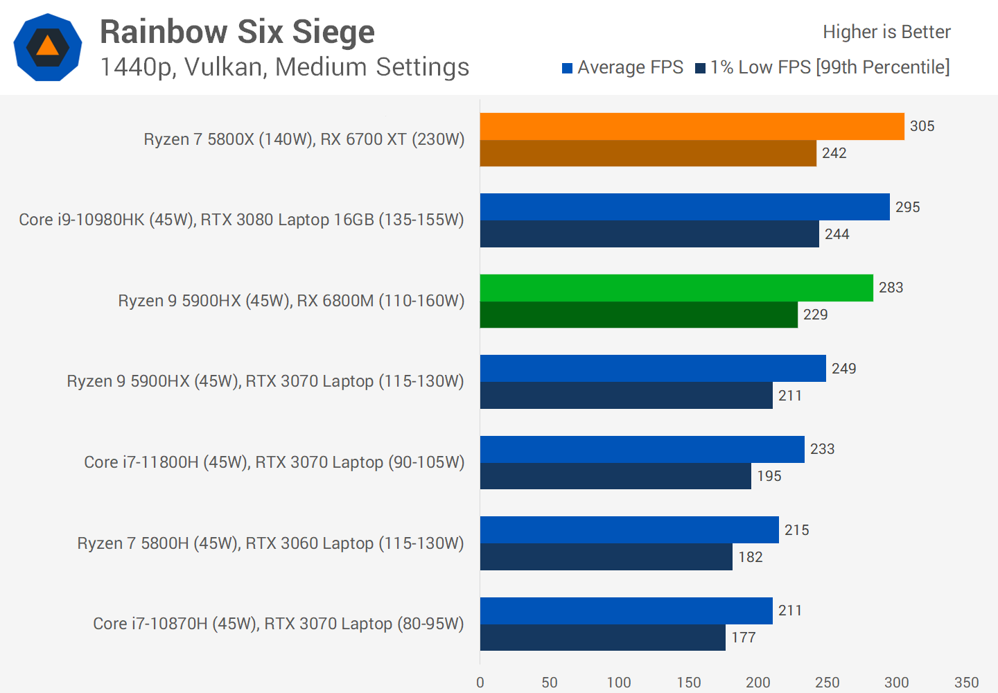 For those interested in competitive titles like Rainbow Six Siege that tend to be CPU limited, even at 1440p, again there isn't much of an advantage to the desktop platform, at least using modern hardware. The 5800X does deliver 8 percent higher frame rates on average, but we're talking about the difference between 283 and 305 FPS, so unless you are extremely sensitive to latency, both of these systems deliver great results.