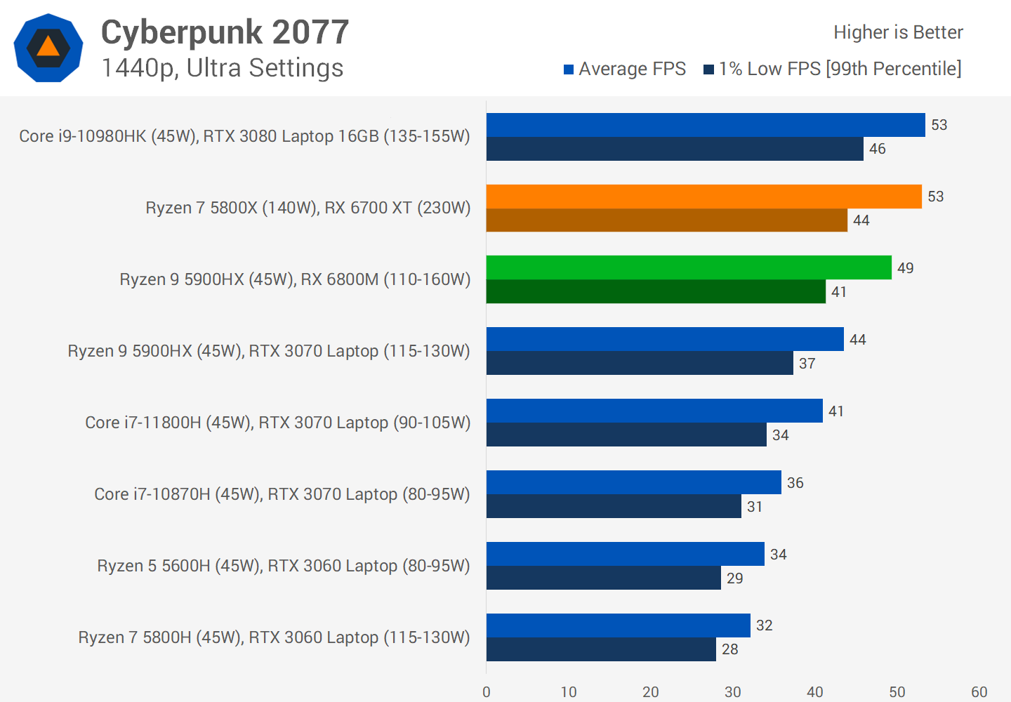 Cyberpunk 2077 is extremely GPU demanding using the Ultra preset at 1440p, so the difference in CPU between the desktop and laptop becomes a bit irrelevant. The Strix G15 from Asus performs remarkably well up against the desktop configuration: the desktop is just 7 percent faster, showing that the 6800M can do almost as well as the 6700 XT with a huge reduction in power. Typically in these GPU heavy scenarios we saw the 6700 XT using 50W more power as measured in HWInfo.