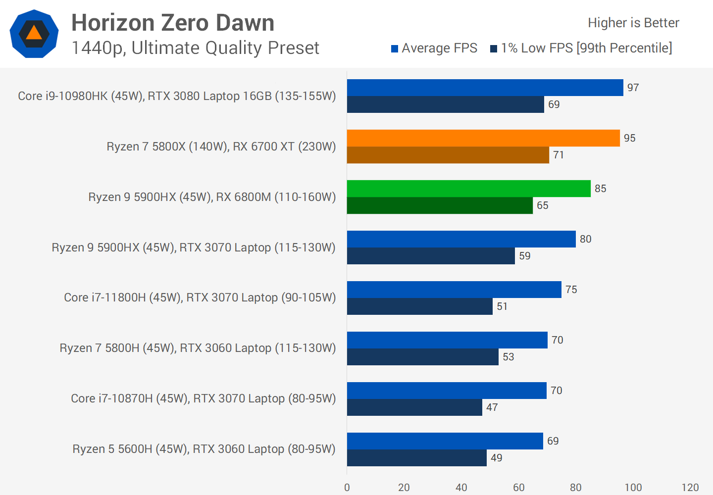 Horizon Zero Dawn is another pretty typical result. The 6700 XT desktop system ended up 12% faster than the 6800M laptop in average frame rates, which is definitely a noticeable difference. The desktop platform is able to edge closer to the 100 FPS mark, although the laptop doesn't perform badly by any means especially given the form factor.