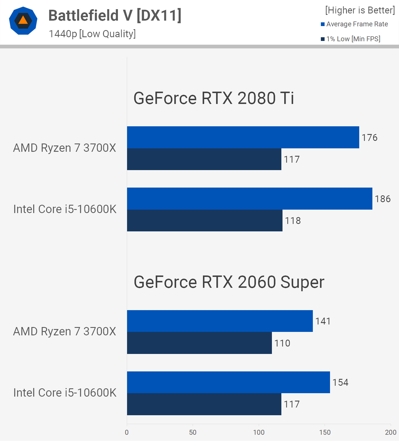 Starting with Battlefield V at 1080p using the low quality preset, we've manually removed the 200 fps cap, setting it to 600 fps. The results with the RTX 2080 Ti look as though they are still capped but we assure you they are not. The 10600K peaked at 211 fps in this test.