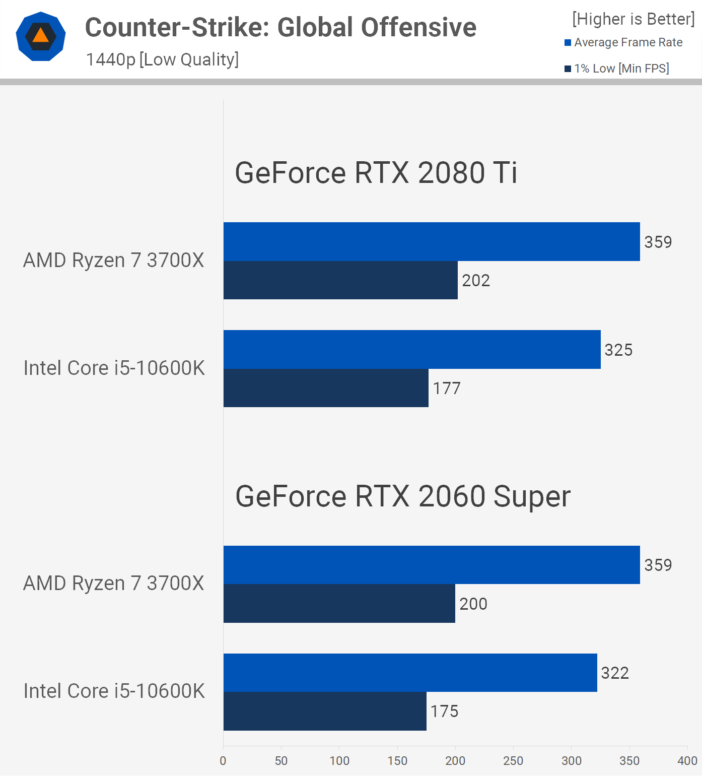 It's also very interesting to note that the margin between the 10600K and 3700X actually grows slightly with the slower GPU, now the Intel processor is 12% faster when comparing the average frame rate and 18% faster when comparing 1% low data. That's a significant delta, though we're still looking at well over 200 fps at all times with the Ryzen processor, so for those of you rocking a 144 Hz monitor, that's probably not going to be an issue for you.