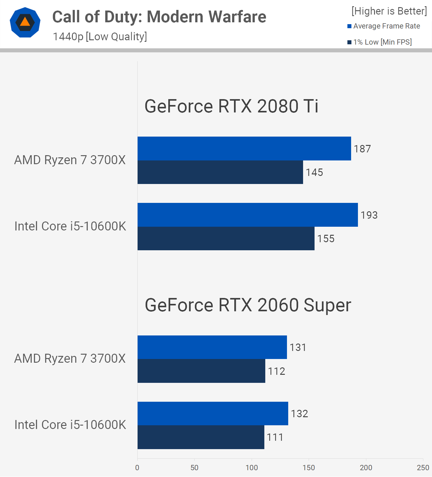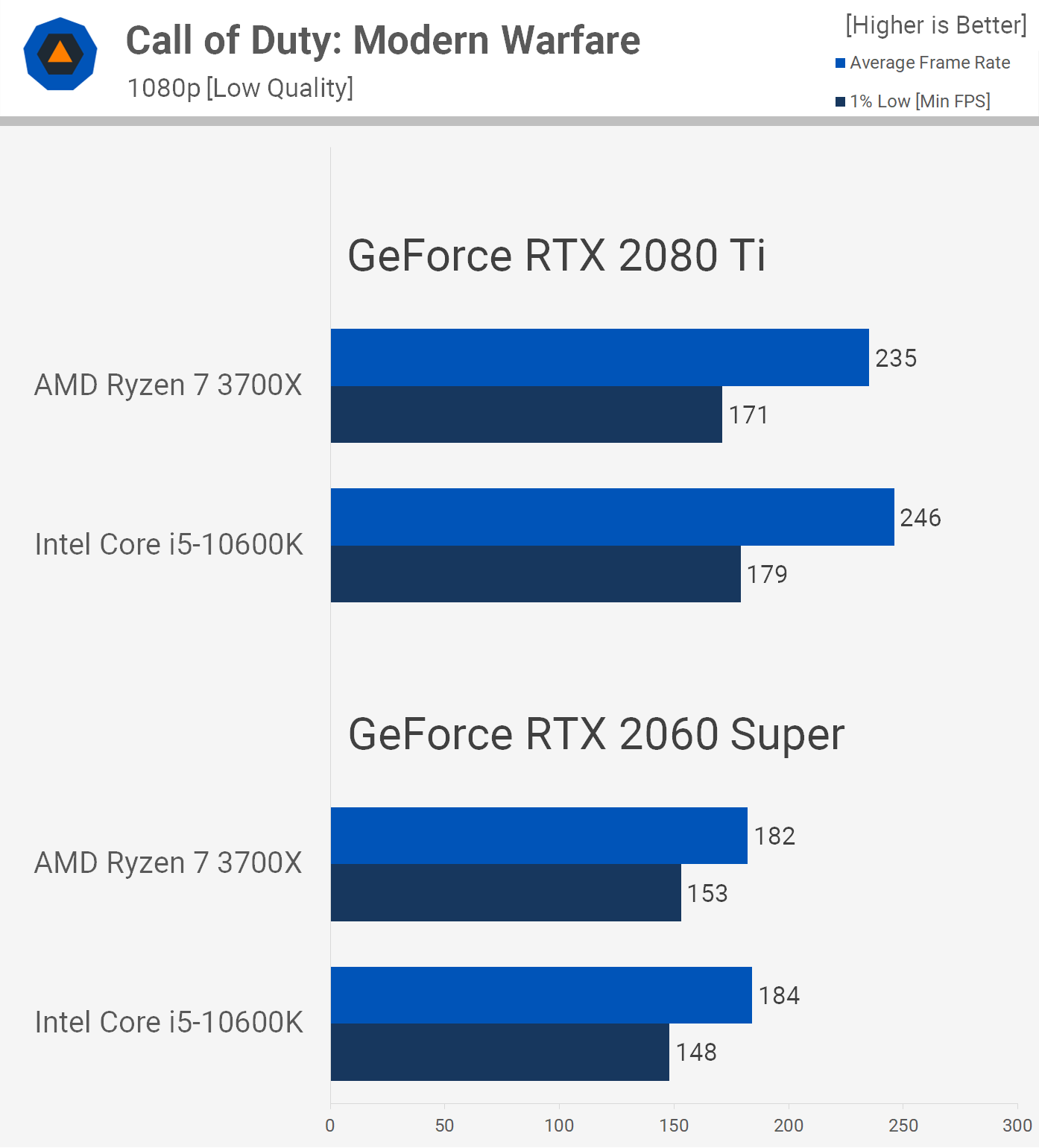 Frame rates in Call of Duty: Modern Warfare using the low quality settings are very competitive, here the 10600K was at most 5% faster.