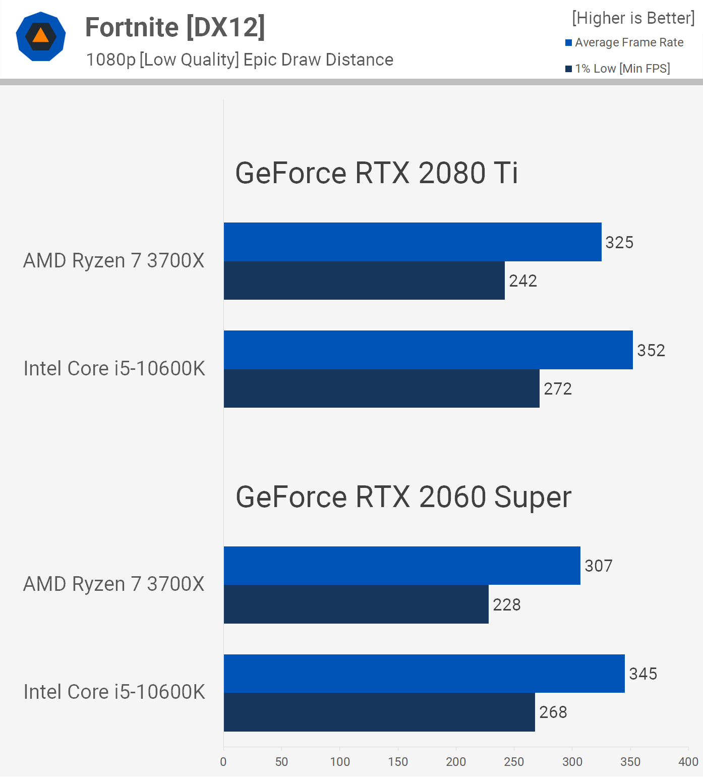 When reviewing the Core i5-10600K for example, we noted that while the Ryzen 7 3700X was 5% slower at 1080p, that margin might grow by a small margin in more CPU-limited gaming scenarios, for instance playing Fortnite with competitive quality settings. This led us to recommend the Intel processor for those who must have every last frame possible, but for everyone else the 3700X is just a better value more well-rounded product.