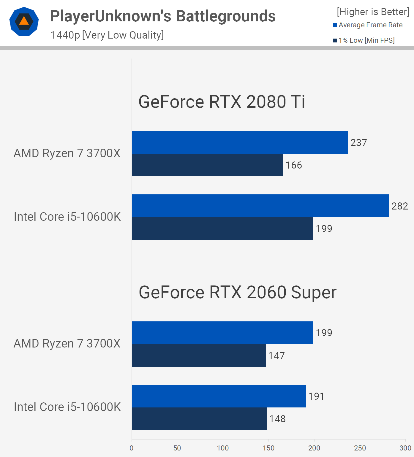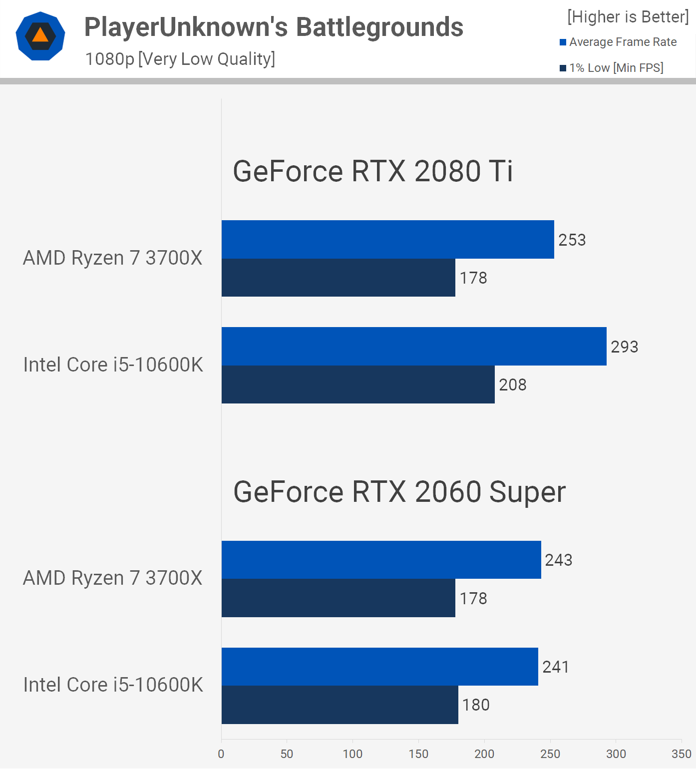 PUBG is a title we know to play better with Intel CPUs when using the high quality settings, so unsurprisingly Ryzen loses here with the very low quality preset enabled. The 10600K was up to 17% faster when using the RTX 2080 Ti at 1080p, keeping the frame rate above 200 fps at all times.