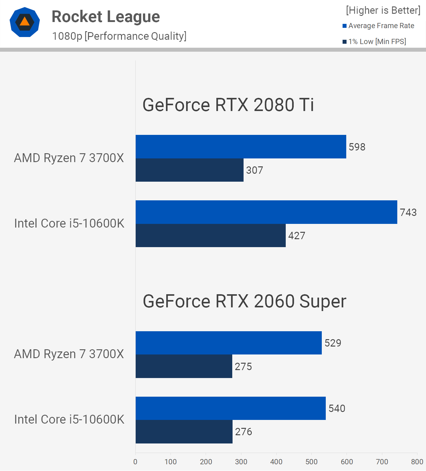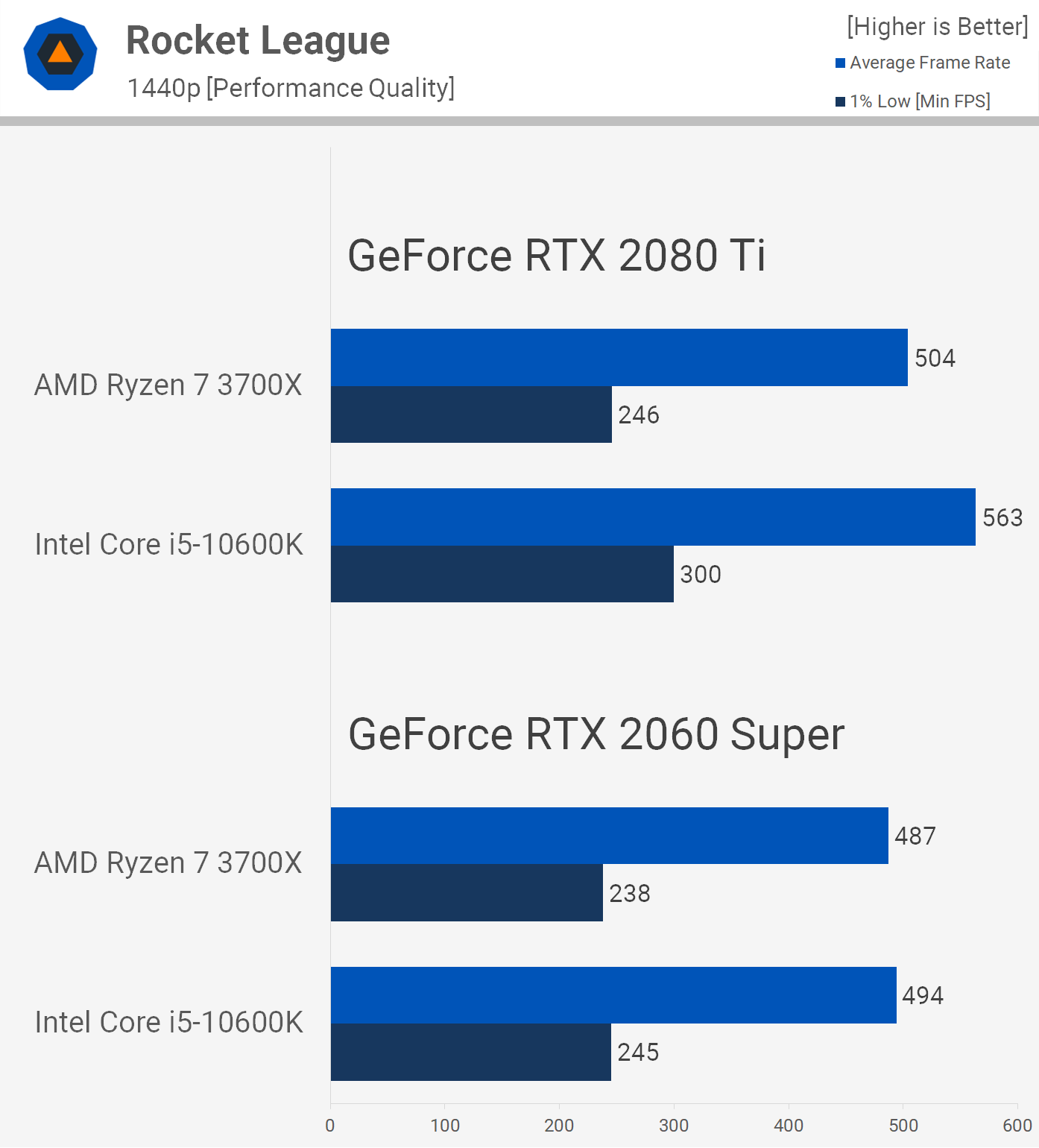 Rocket League has a 250 fps cap but you can remove that by editing a configuration file and we've done exactly that for testing. The 10600K destroys the 3700X in Rocket League with the limits removed, boosting 1% low performance with the RTX 2080 Ti by almost 40% and the average frame rate by 24%.
