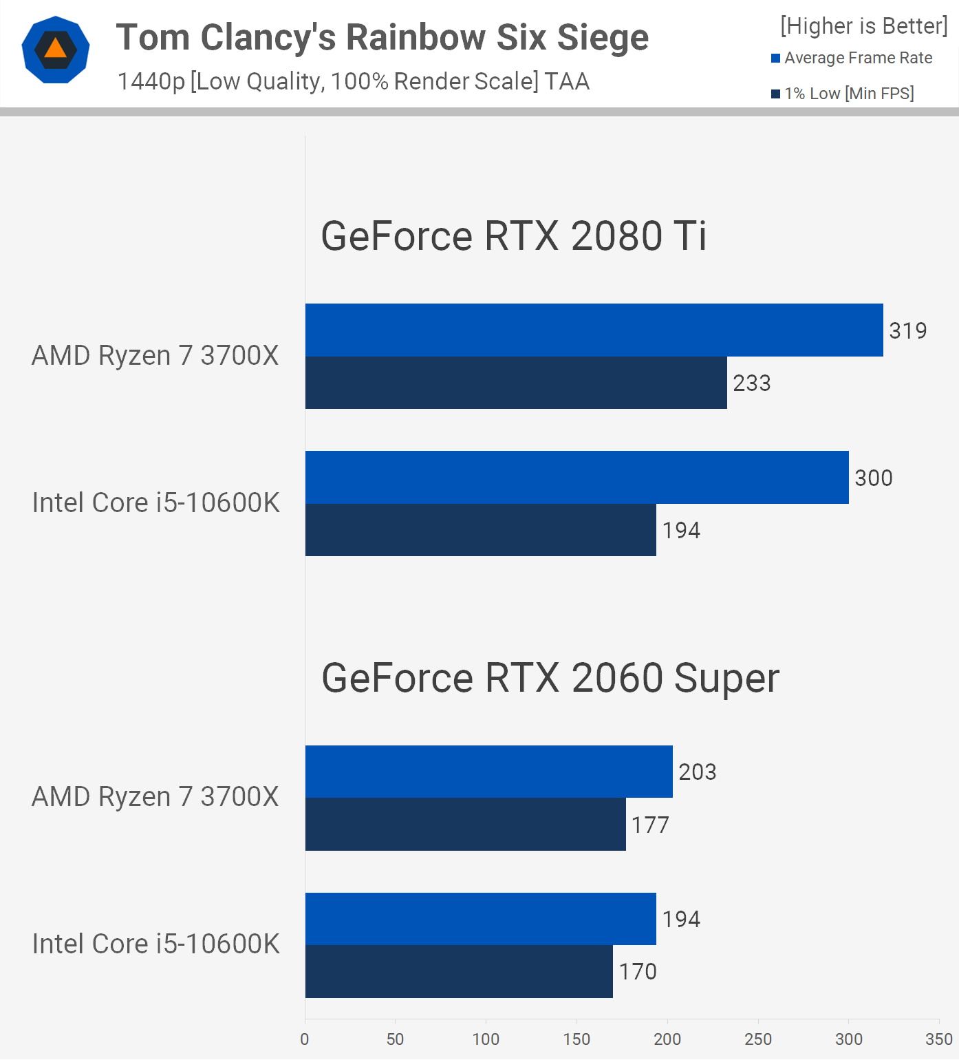 Moving to 1440p and here we start to see some separation. These results really do hint at a frame cap for the 1080p testing but that wasn't the case. Anyway, at 1440p the 10600K was up to 6% faster than the 3700X with the RTX 2080 Ti installed, though the 1% low performance was virtually identical.