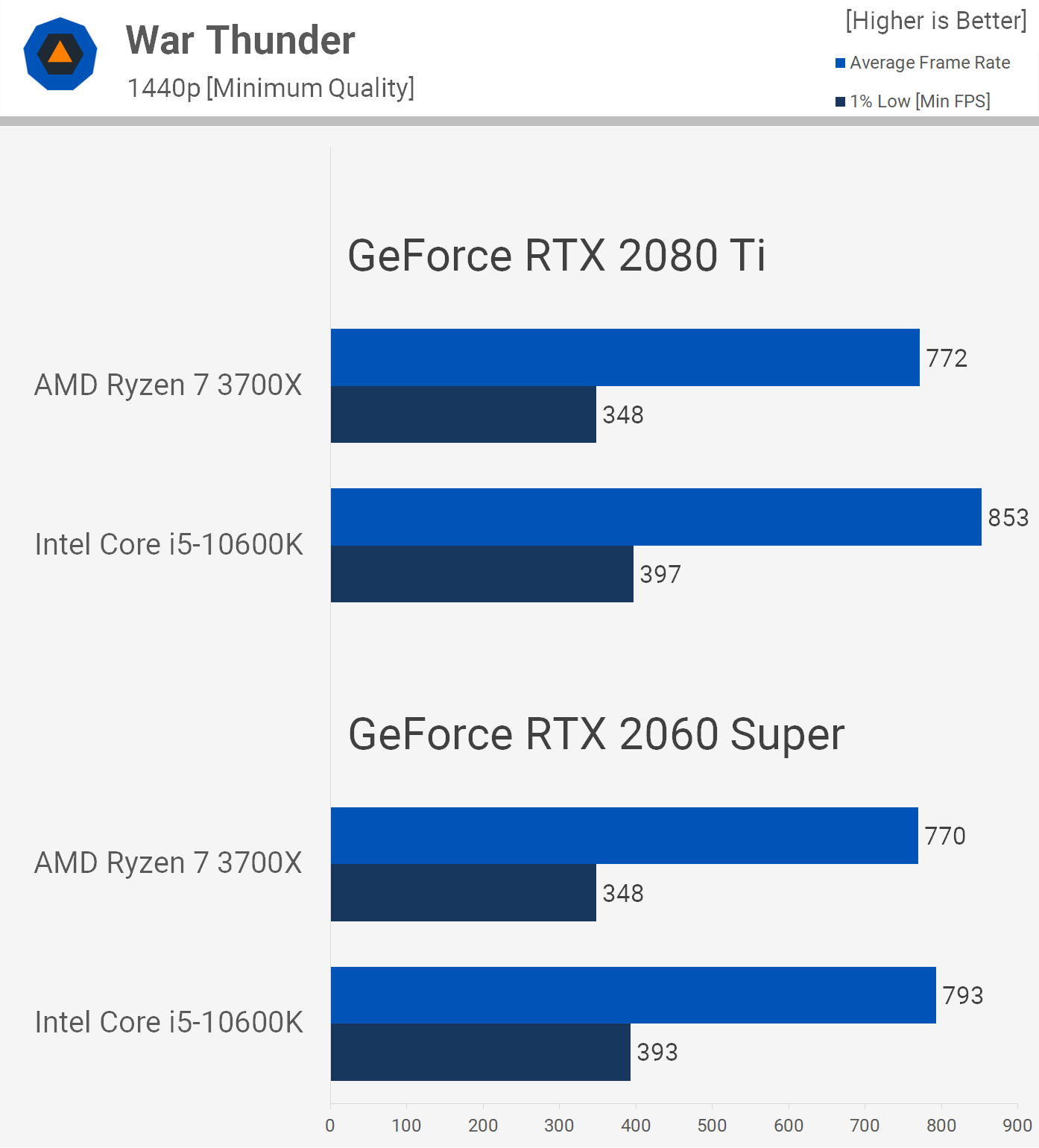 The last game we tested is War Thunder which is showing some pretty wild frame rates using either GPU or CPU. In both cases we are CPU bound, and looking at well over 350 fps at all times.