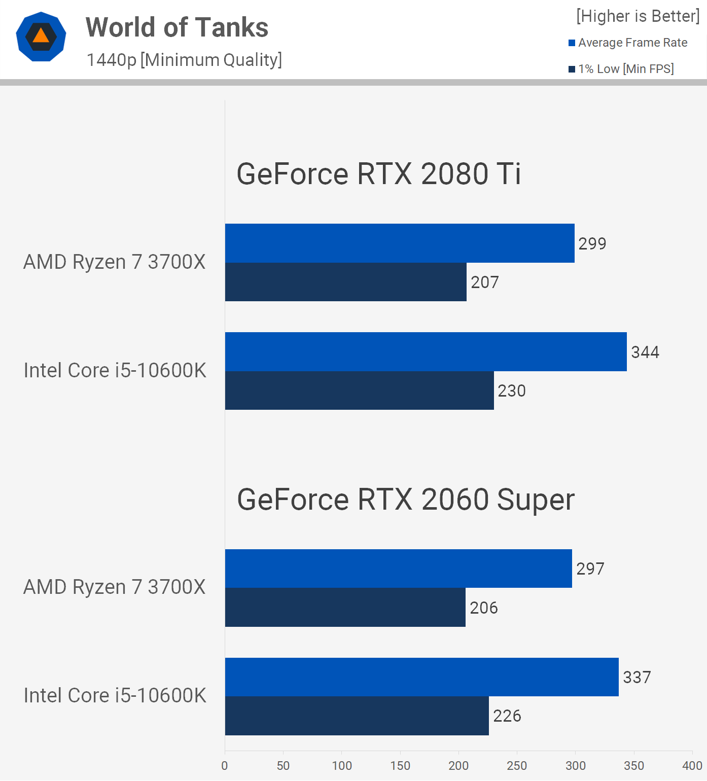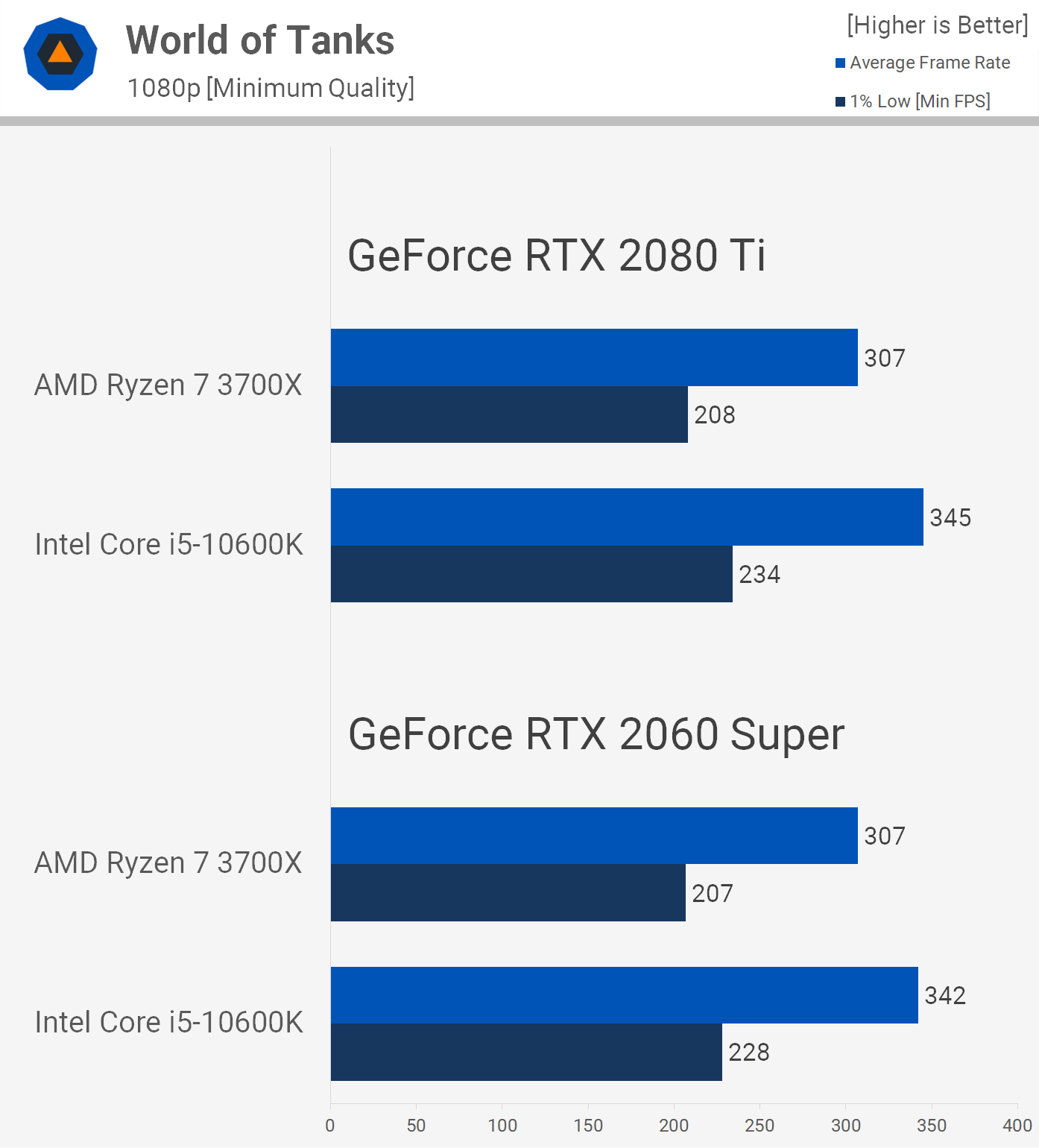 Next up we have World of Tanks using the HD Client but with the minimum quality settings enabled. Here we're looking at a strong CPU bottleneck as both the RTX 2080 Ti and 2060 Super see the same level of performance. We're also looking at over 200 fps at all times, making the 10600K up to 13% faster. This is another game where I'm not sure going over 200 fps is beneficial to anyone, so the margin between these AMD and Intel processors could very well be irrelevant.