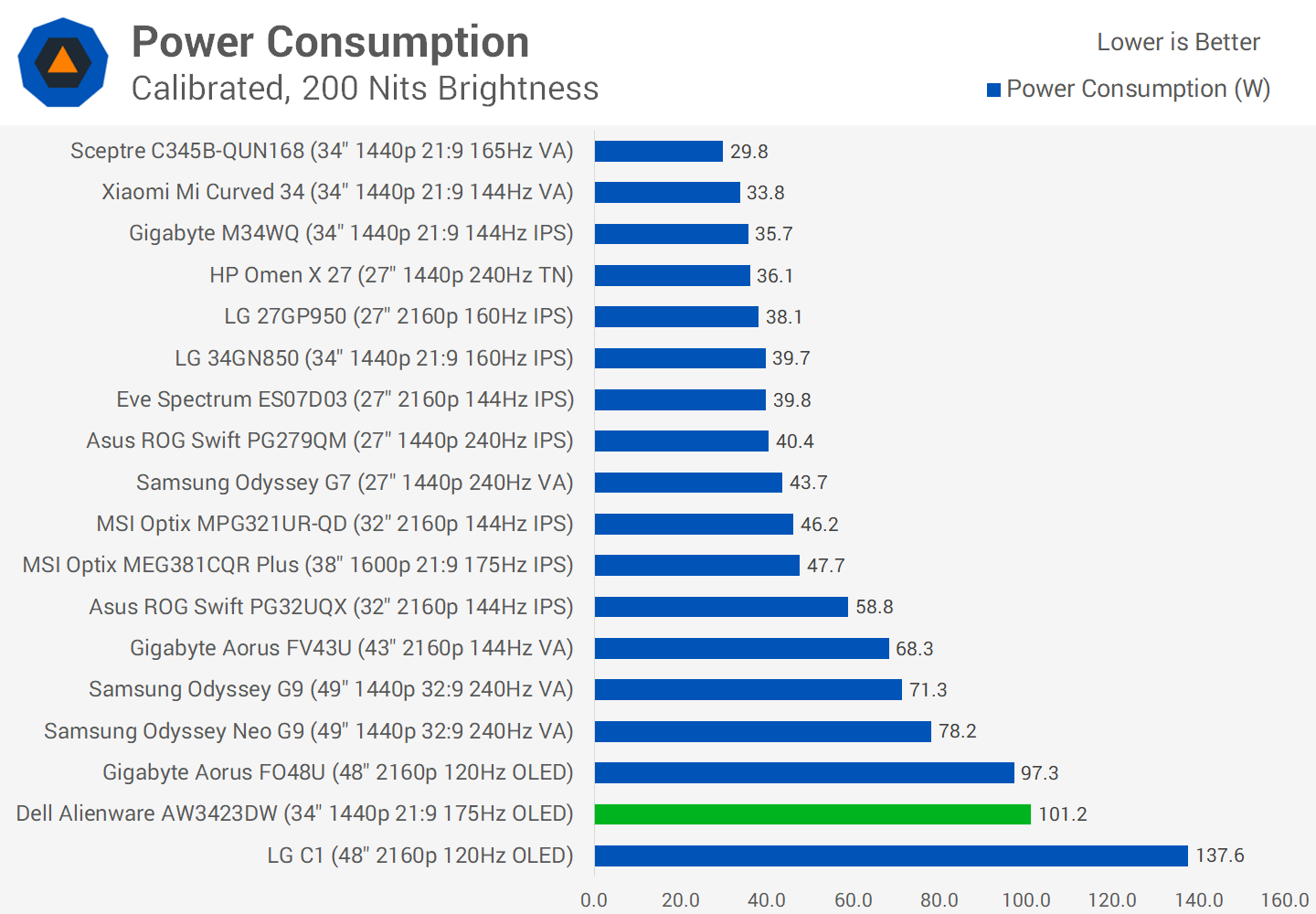 Another contentious issue is power consumption. OLEDs are power hungry, especially when viewing full white images, which is the worst case scenario for an OLED. Displaying white uses around 2.5x more power than a traditional LCD, although at least the AW3423DW can actually display 200 nits, unlike the FO48U and C1.