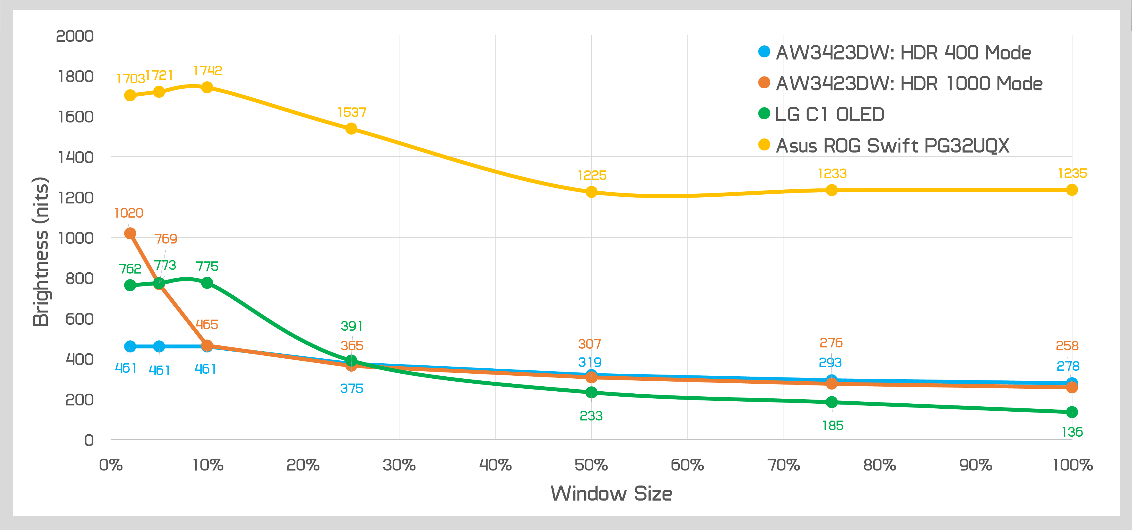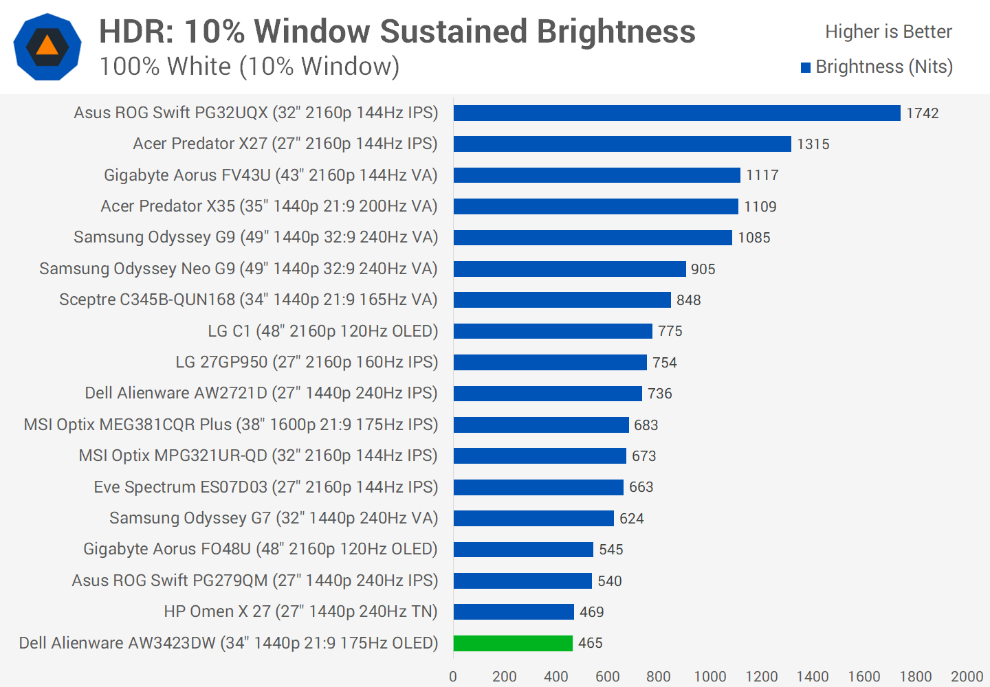 Despite this, in comparison charts, OLED panels do fare poorly in brightness. Full screen sustained brightness is low relative to the best LCDs, and flash brightness isn't any better as OLEDs typically have no difference between sustained and peak brightness. The quick fall-off for brightness also sees the AW3423DW end up last for 10% brightness, I'd really like to see this be up over 600 nits, even if at times you get 800 nits plus for small bright elements.