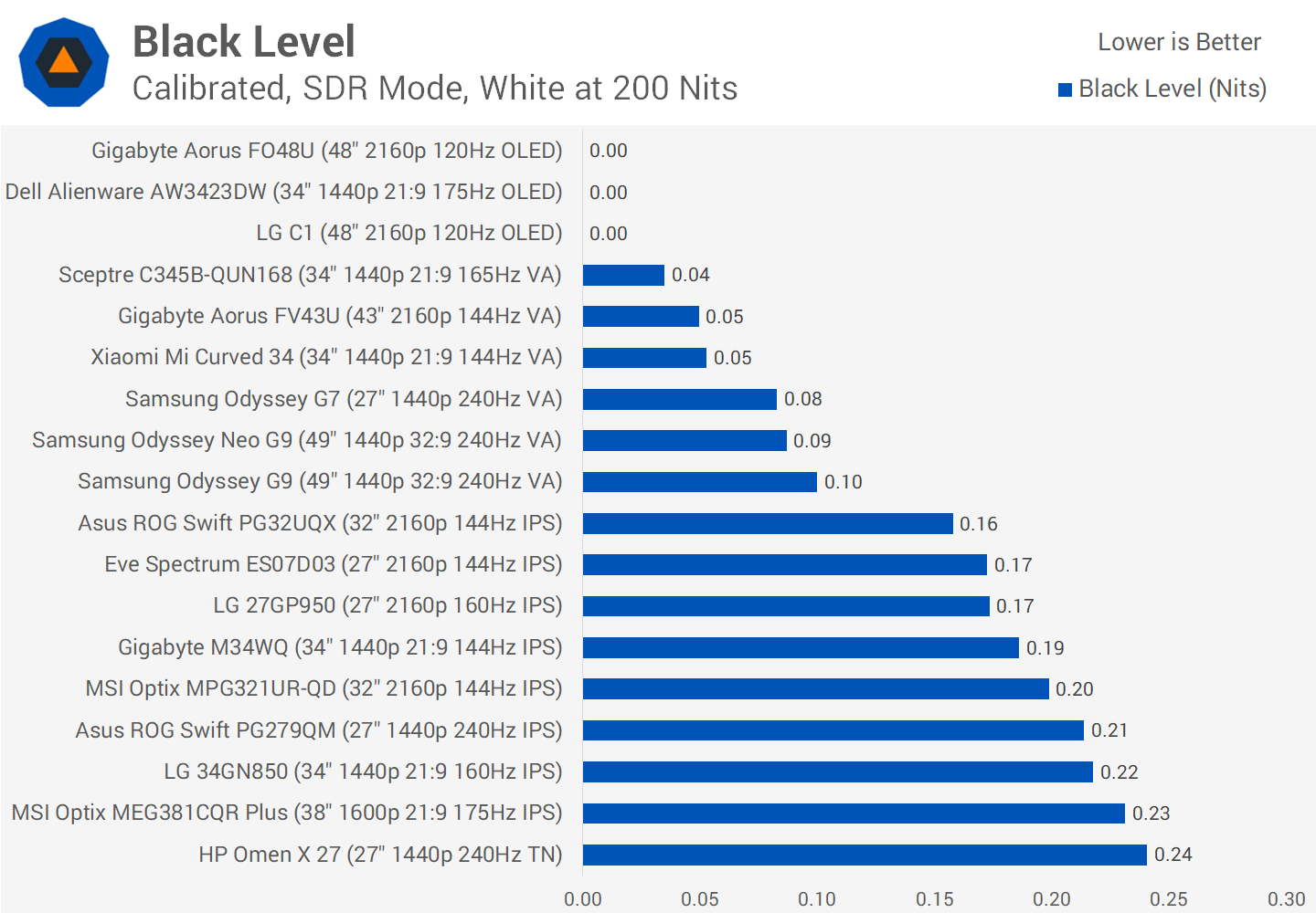 As for contrast, all OLEDs are self-lit, there's no backlight, so when displaying black each pixel can fully switch off. This leads to an effectively infinite contrast ratio, though for this review we'll show black level instead. This is mostly just to illustrate how other display technologies compare, you'll see that even though VA LCDs can get reasonably dark, they still have a way to go to reach the 0 black levels we see from OLED.