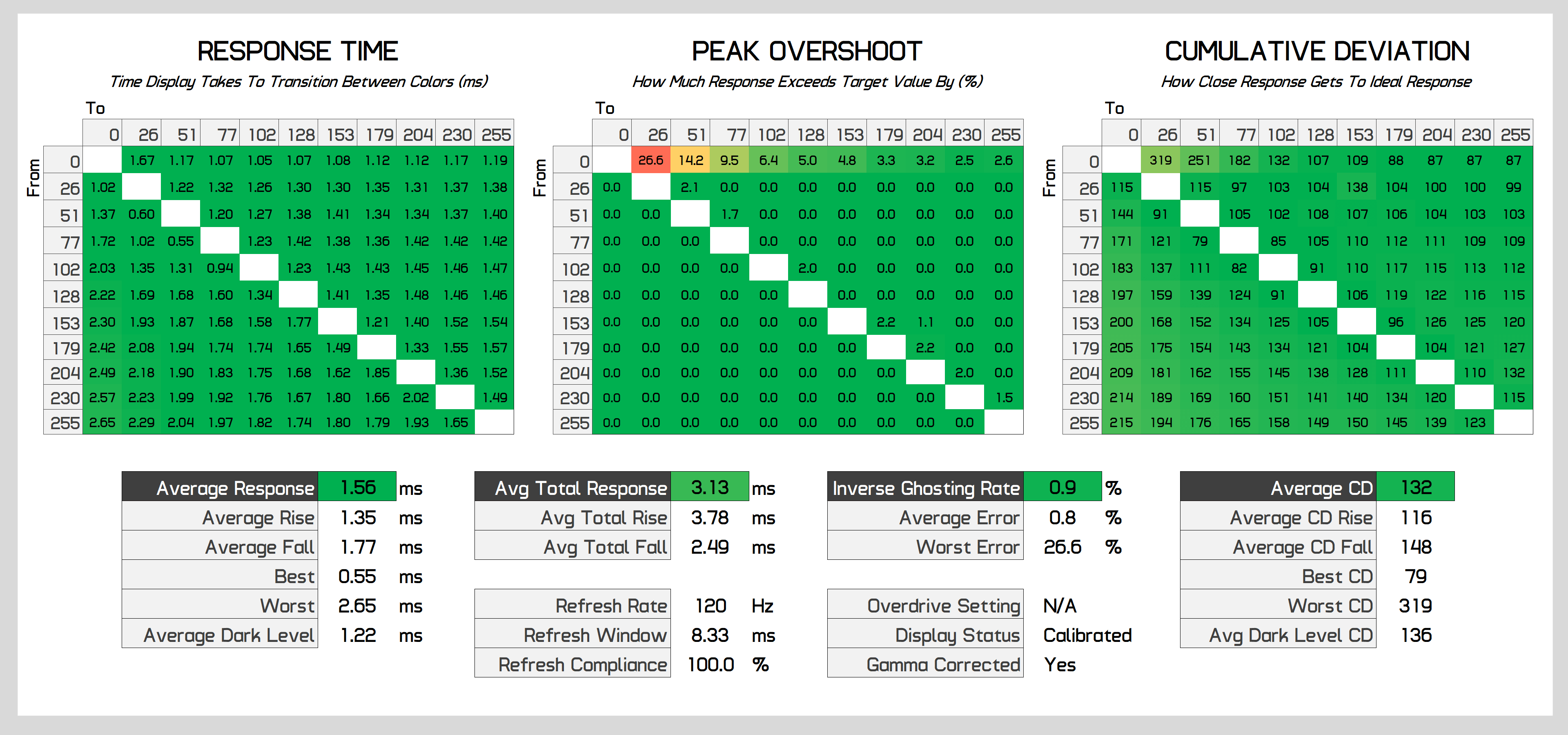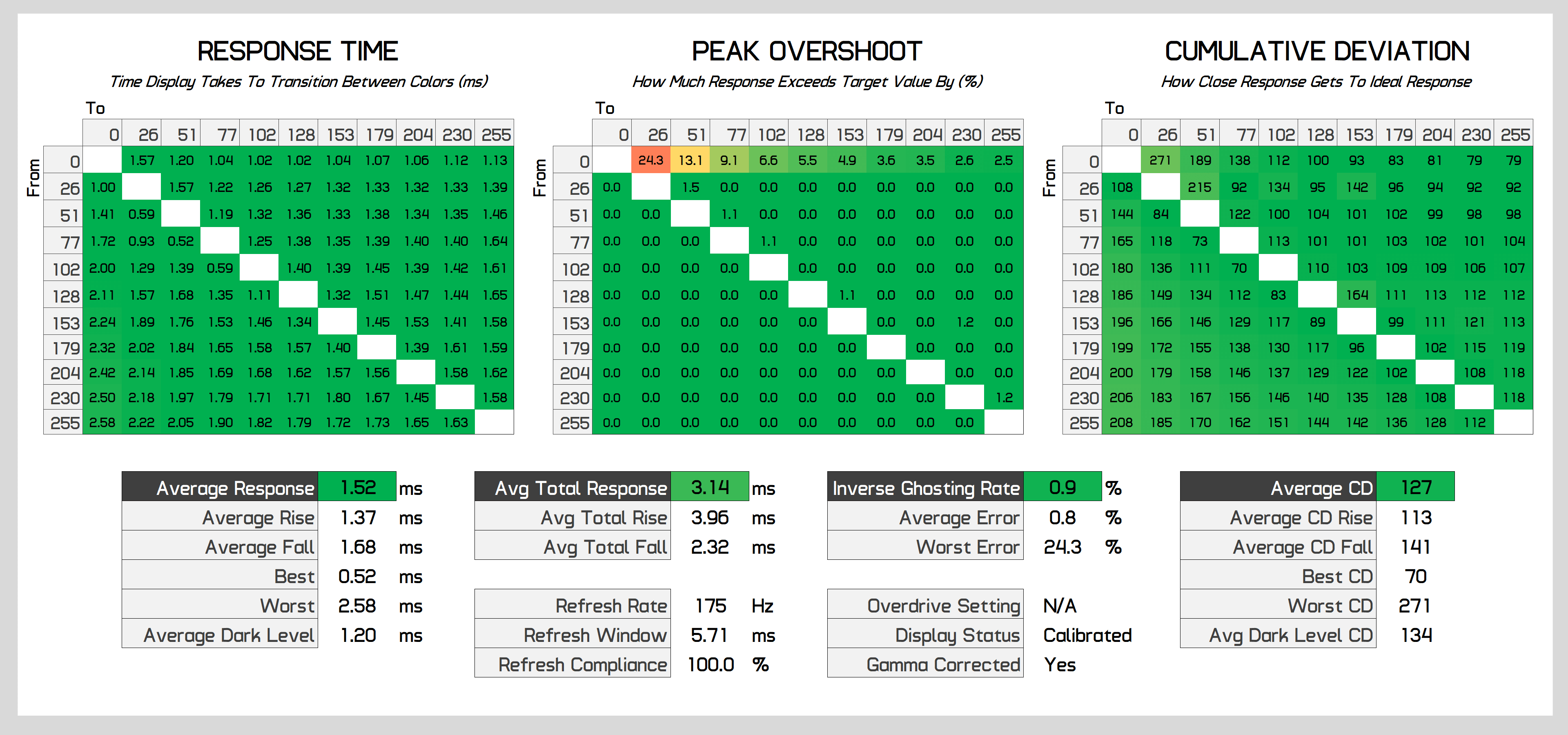 Let's talk motion performance now. This in an OLED is very straightforward: no overdrive settings to worry about. The performance at 175 Hz is excellent, with response times in the 1.5ms range using our stringent test methodology. A tiny minority of transitions had a few overshoot concerns but nothing to be worried about, and of course cumulative deviation results were excellent as well, due to the extreme speed on offer with OLED.