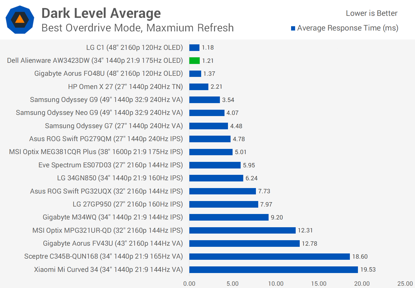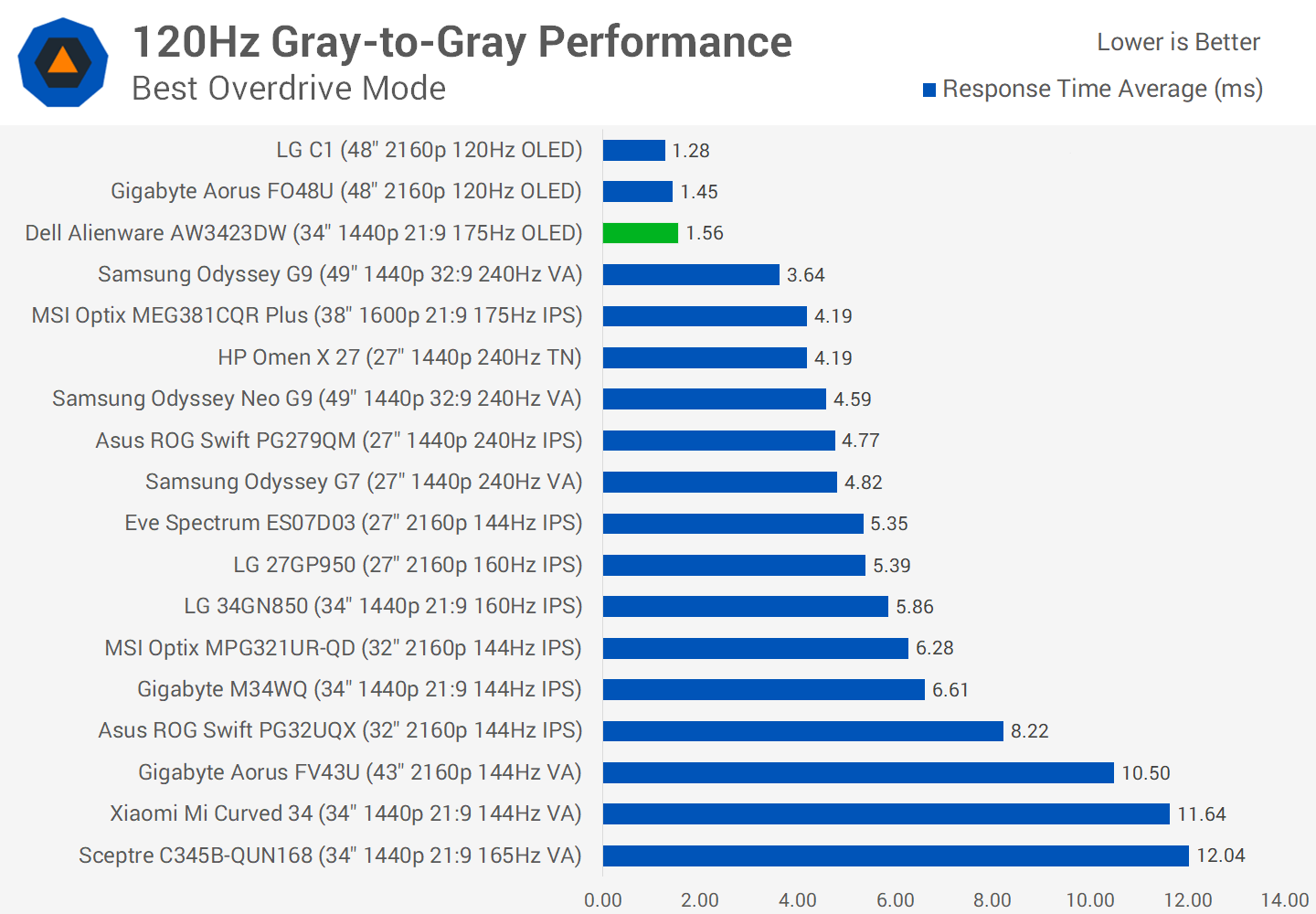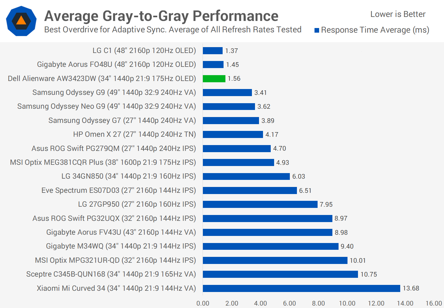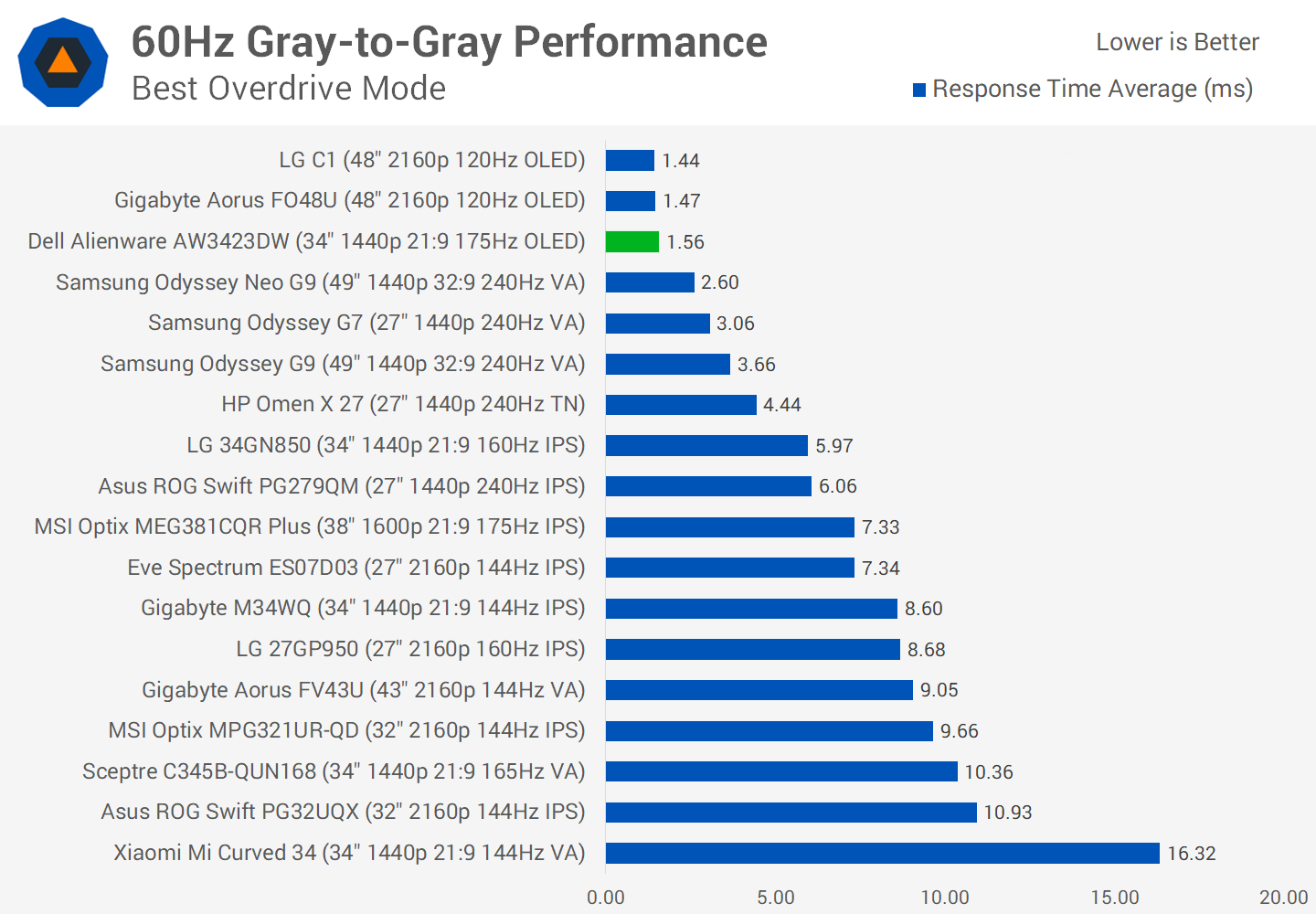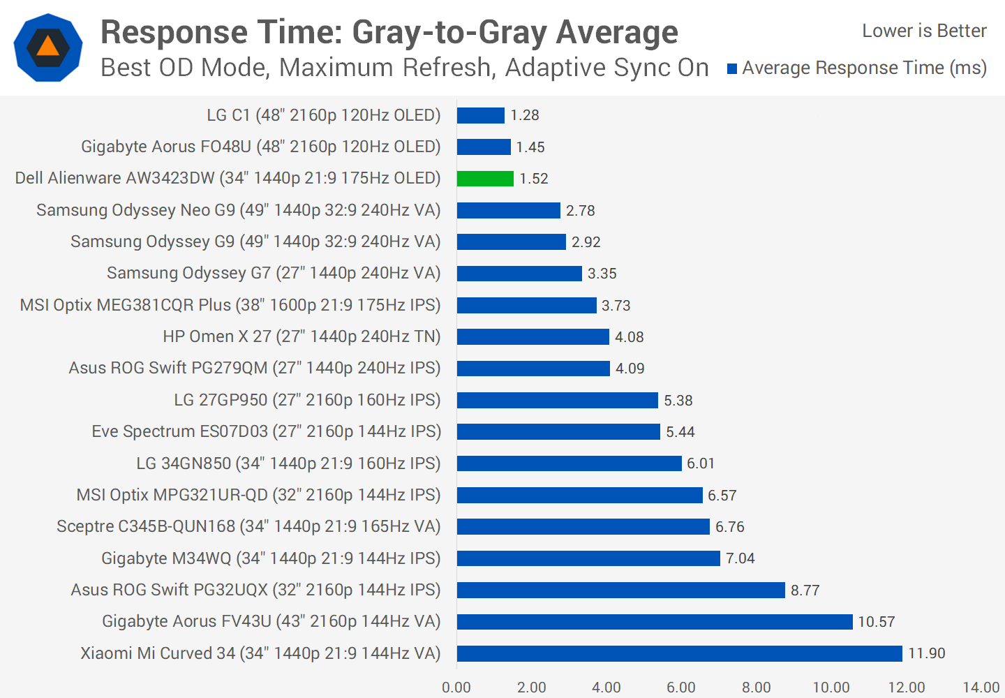 The AW3423DW is 2.5x better than its nearest VA LCD competitor, and 4x better than today's fast IPS monitors.